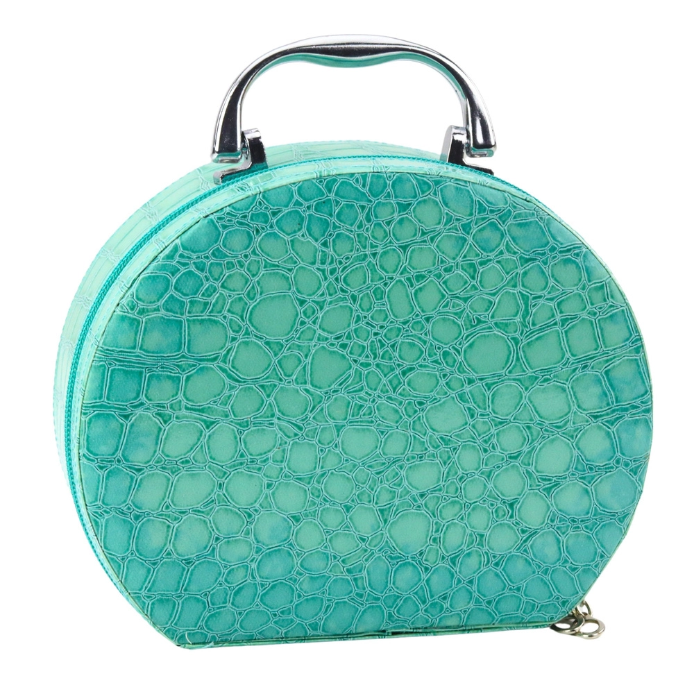 Rond turkoois cosmetictasje met metalen handgreep en rits houdt alle accessoires veilig en binnen handbereik – ideaal voor thuis en op reis.