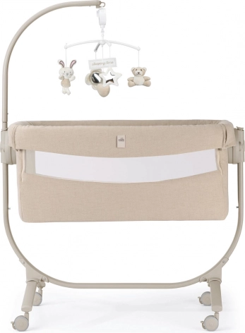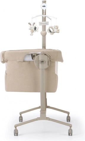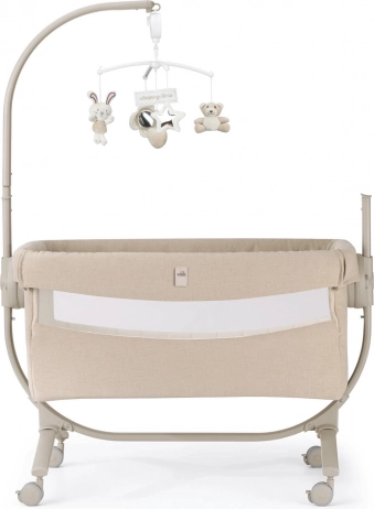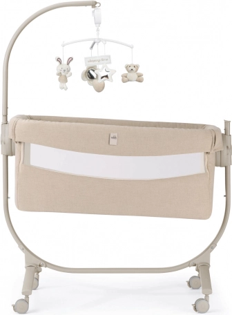 De praktische aanschuifwieg Cullami voor pasgeborenen biedt 8 hoogtestanden, een afneembare zijwand voor eenvoudig aanzetten aan het bed en een wiegfunctie voor rustig inslapen. Het stevige metalen frame met wieltjes en remmen, de mogelijkheid tot kantelen van het ligvlak en het zijwaarts verschuiven van de hele bak met 16 cm zorgen voor maximale aanpassing. Inclusief muziek-mobiel met pluchen speeltjes voor zachte stimulatie en kalmering van de baby.
