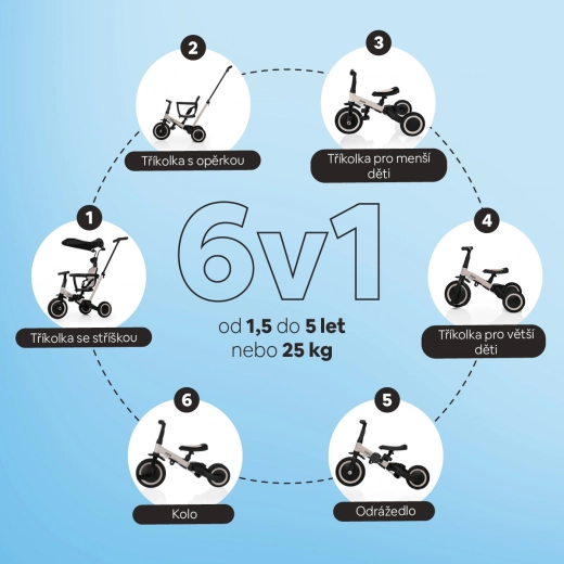 6-in-1 voor elke leeftijd: driewieler met kap en duwstang, driewieler met rugsteun, driewieler voor kleinere en grotere kinderen, loopfiets en eerste fiets. Daarbij een veiligheidsbeugel, 5-puntsgordels, hoofdsteun, antislip handvatten en pedalen met antislip, die ook als voetensteun kunnen worden gebruikt.