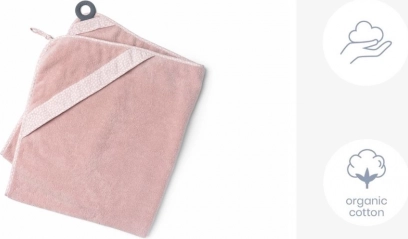 Praktische en zachte handdoek met capuchon Doomoo Dry & Play in het roze, met een slim siliconen ringetje voor gemakkelijk ophangen rond de nek, zodat je tijdens het baden je handen vrij hebt, beschermd bent tegen spatten en na het bad de handdoek eenvoudig kunt gebruiken om je baby snel in te wikkelen. Het siliconen ringetje dient bovendien als bijtspeeltje. Gemaakt van zachte biologische katoen met OEKO-TEX-certificering.