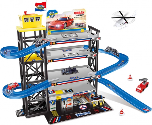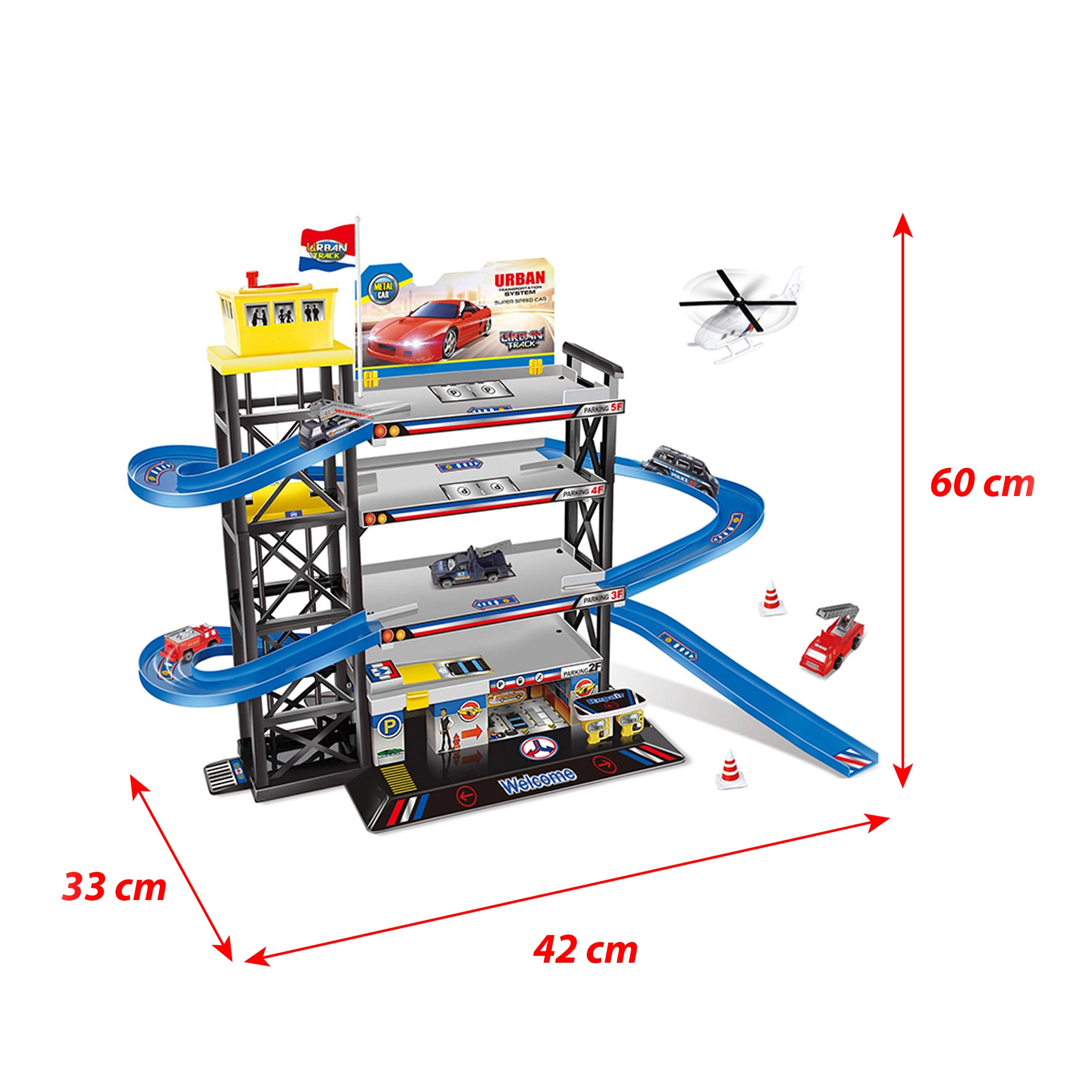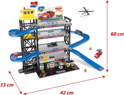 Rangschik je wagenpark in een overzichtelijke vierlaagse garage met helikopterplatform! Inclusief 4 verdiepingen, helikopter en 3 metalen autootjes van ca. 7–8 cm lang. De garage meet na montage 42 × 60 × 33 cm en is geschikt voor kinderen vanaf 4 jaar. Het is niet mogelijk een specifiek model te kiezen. Let op: het product is verpakt in een vervangende verpakking.