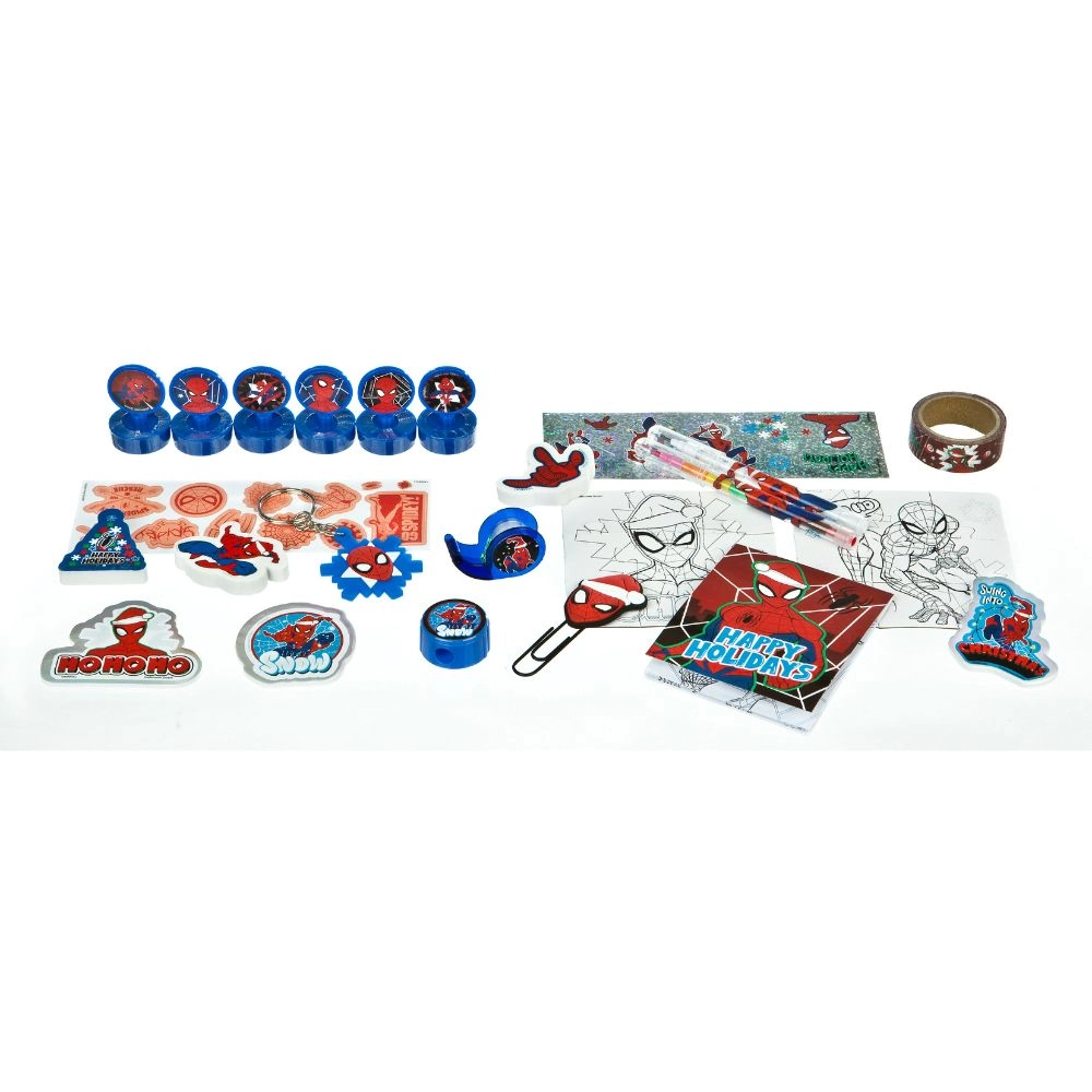 Binnenin wachten kleinigheden zoals mini-stempels, puzzel, sleutelhanger, tape met dispenser, laserstickers, mini potlood, mini kleurpotlood, schudstickers, paperclips, notitieblok, gevormde gummetjes en washi-tape. Elk vakje is een klein avontuur en zal alle SPIDER-MAN liefhebbers verheugen.