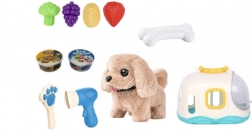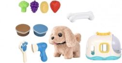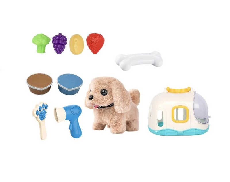 Het praktische huisje dient zowel als knus onderkomen als draagkoffertje, zodat kinderen het hondje overal mee naartoe kunnen nemen. In de verpakking zit ook verzorgingsaccessoire – een kam en een föhn – en plastic lekkernijen in de vorm van fruit en groenten om voerspelletjes te spelen.