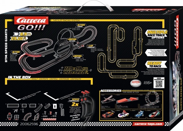 Beleef spannende races met de CARRERA GO!!! DTM Speed Giants racebaan van 8,9 m. De set bevat gedetailleerde auto's Audi R8 LMS GT3 en Lamborghini Huracán GT3, een looping, een gebankte bocht, een verticale wand en een mechanische rondenteller. Dankzij de Turbo-functie op de controllers, magneten en dubbele sleperborstels is de rit snel, stabiel en leuk voor kinderen vanaf 6 jaar.