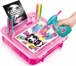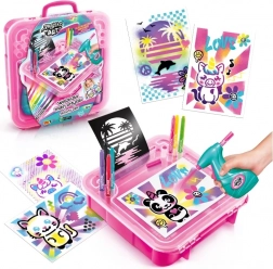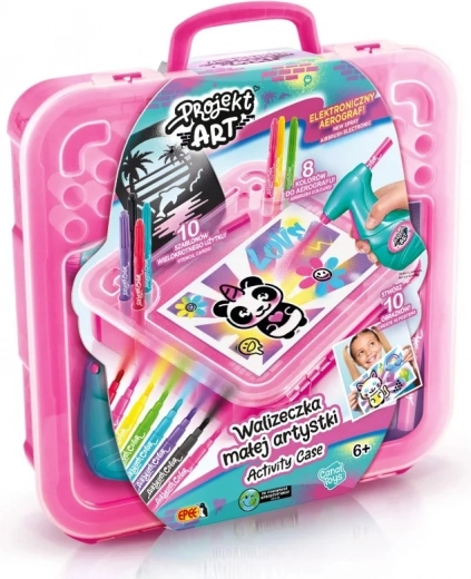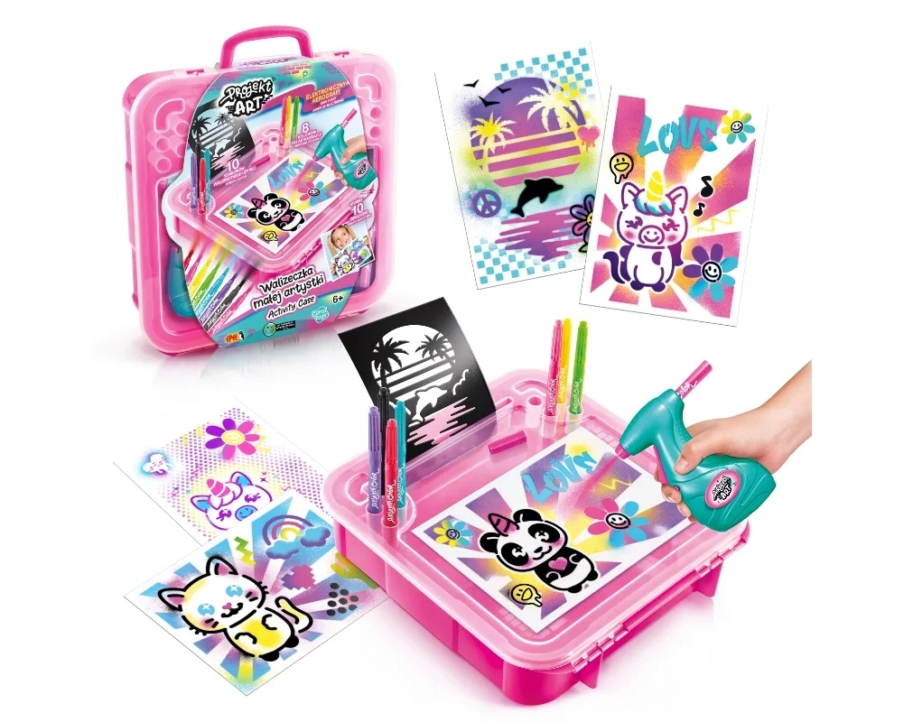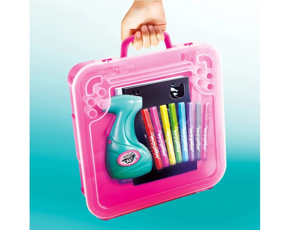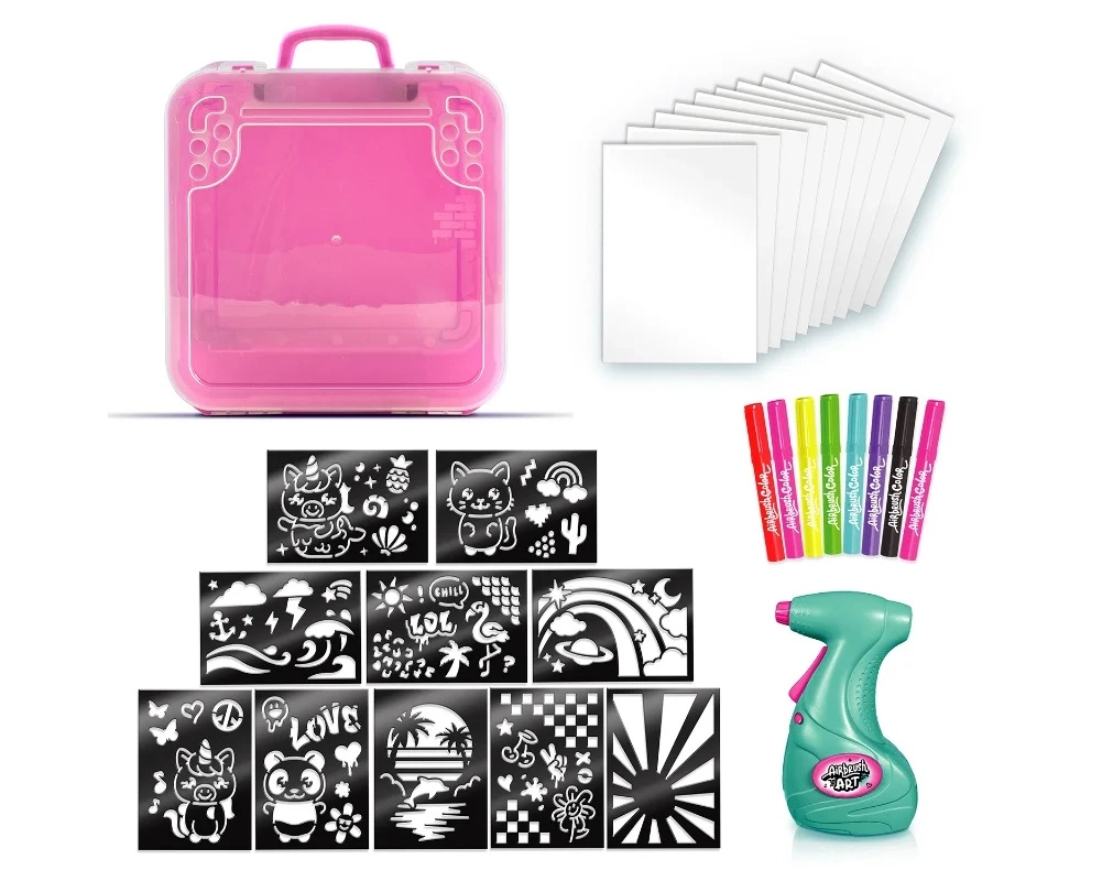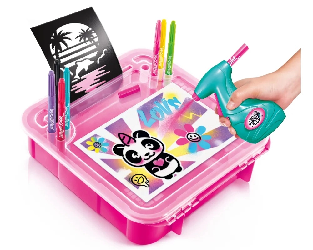Het lichte en draagbare koffertje bevat alles wat een kleine kunstenaar nodig heeft: airbrush, papier, sjablonen en verf. Dankzij de eenvoudige bediening en het veilige ontwerp is de set een geweldig cadeau dat fijne motoriek, creativiteit en zelfexpressie stimuleert.