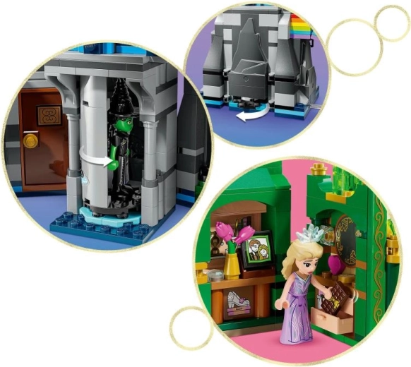 Ontdek iconische WICKED-locaties in één pakket: de elegante Smaragdstad met een stijlvolle kamer en een verborgen kaart van het land Oz, en het donker ogende kasteel Kiamo Ko met een draaimechanisme en een geheime schuilplaats voor Elphaba. De regenboogbrug van stenen laat kinderen hun eigen verhalen vertellen en de set als stijlvolle kamerdecoratie uitstallen.