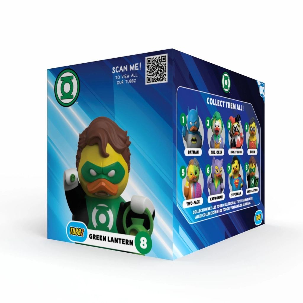Duik in de DC-wereld met het schattig-dappere TUBBZ-eendje in de gedaante van GREEN LANTERN. De figuur is voorzien van het legendarische Corps-embleem, groen pak, masker en ring – alles in de kenmerkende eendenstijl met oog voor detail. Komt prachtig tot zijn recht op een plank, bureau of bij het bad (geen water-speelgoed).