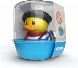 Schattige mini-eend geïnspireerd op Frankrijk brengt charme en stijl in bad en vitrinekast. Hij draagt een zwarte baret, een gestreept shirt en een rode sjaal. Ideaal als cadeau, decoratie en badspeelgoed. Compact formaat 5,5 cm, duurzame afwerking en drijvend design voor dagelijks plezier.