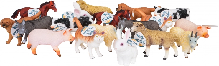 - schaap 18 × 6 × 14 cm; koe 21 × 6 × 12 cm; hond 22 × 7 × 13,5 cm; ezel 21 × 5 × 14,5 cm; varken 20 × 7 × 12 cm; paard 22 × 6 × 15 cm; geit 18,5 × 5,5 × 13 cm; kat 20 × 5 × 14 cm; konijn 14 × 8 × 14 cm
