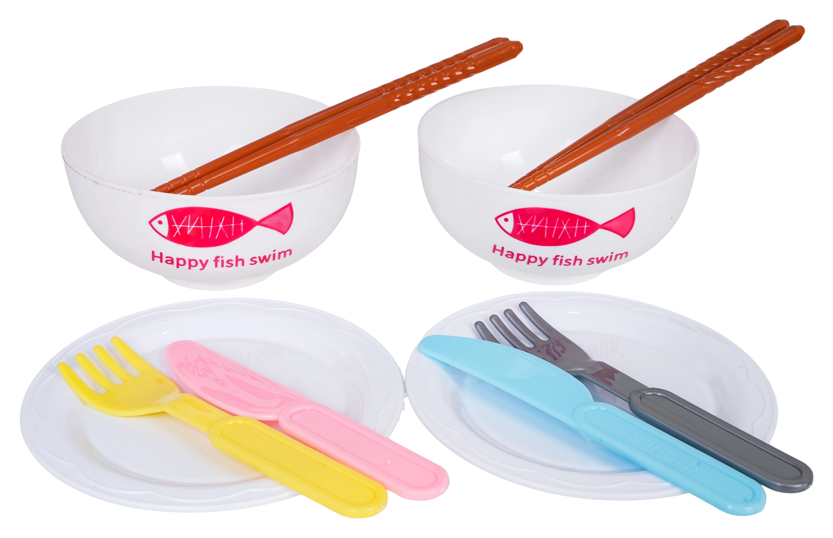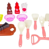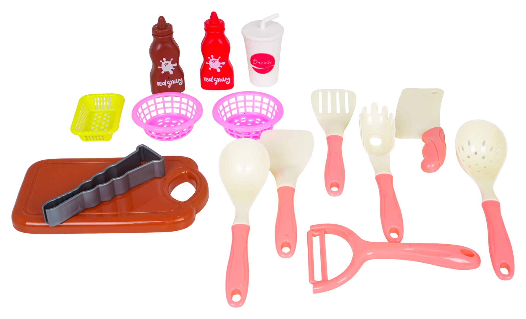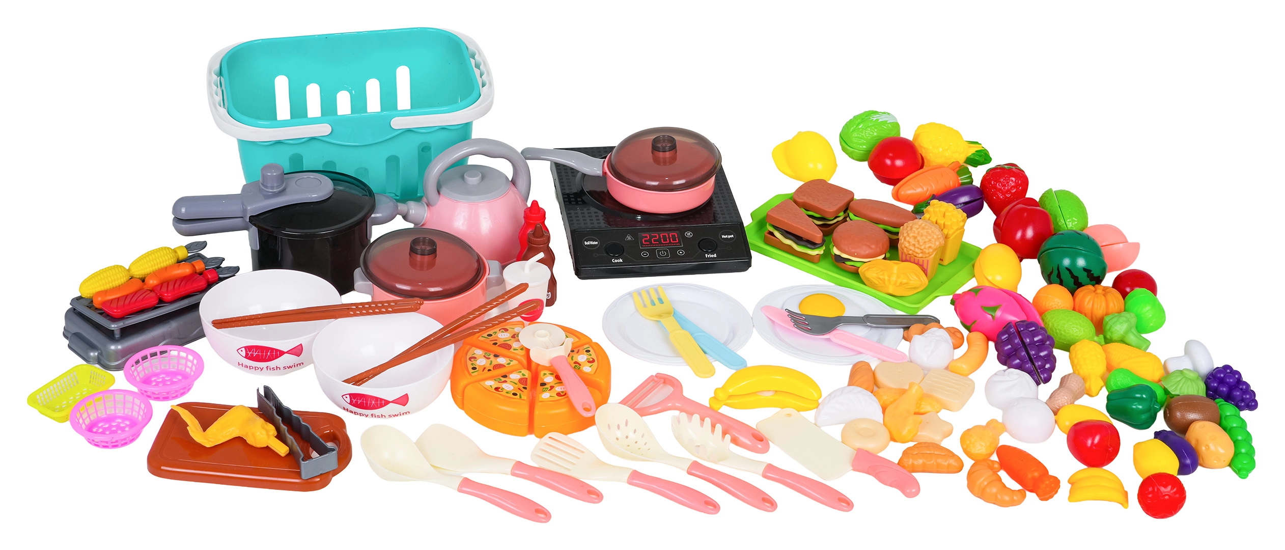 inductiekookplaat, grote boodschappenmand, pan met deksel, koekenpan met deksel, snelkookpan, waterkoker, grill, snijplank, dienblad, kommetjes, kleine mandjes, tang, pastalepel, soeplepel, 2× spatel, pizzasnijder, schiller, hakbijl, stokjes, vorken, messen, bordjes, snij-etenswaren met klittenband (fruit, groenten), pizza met klittenband, spiesen, broodjes, desserts, fastfood en andere accessoires.