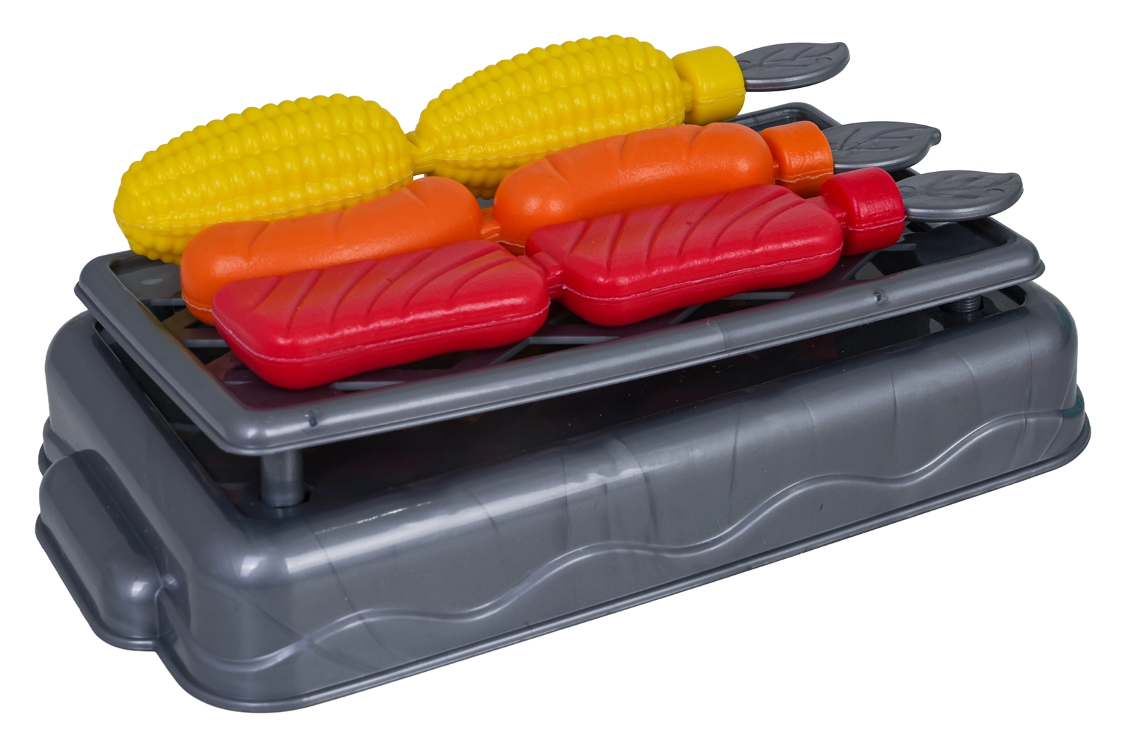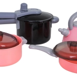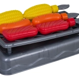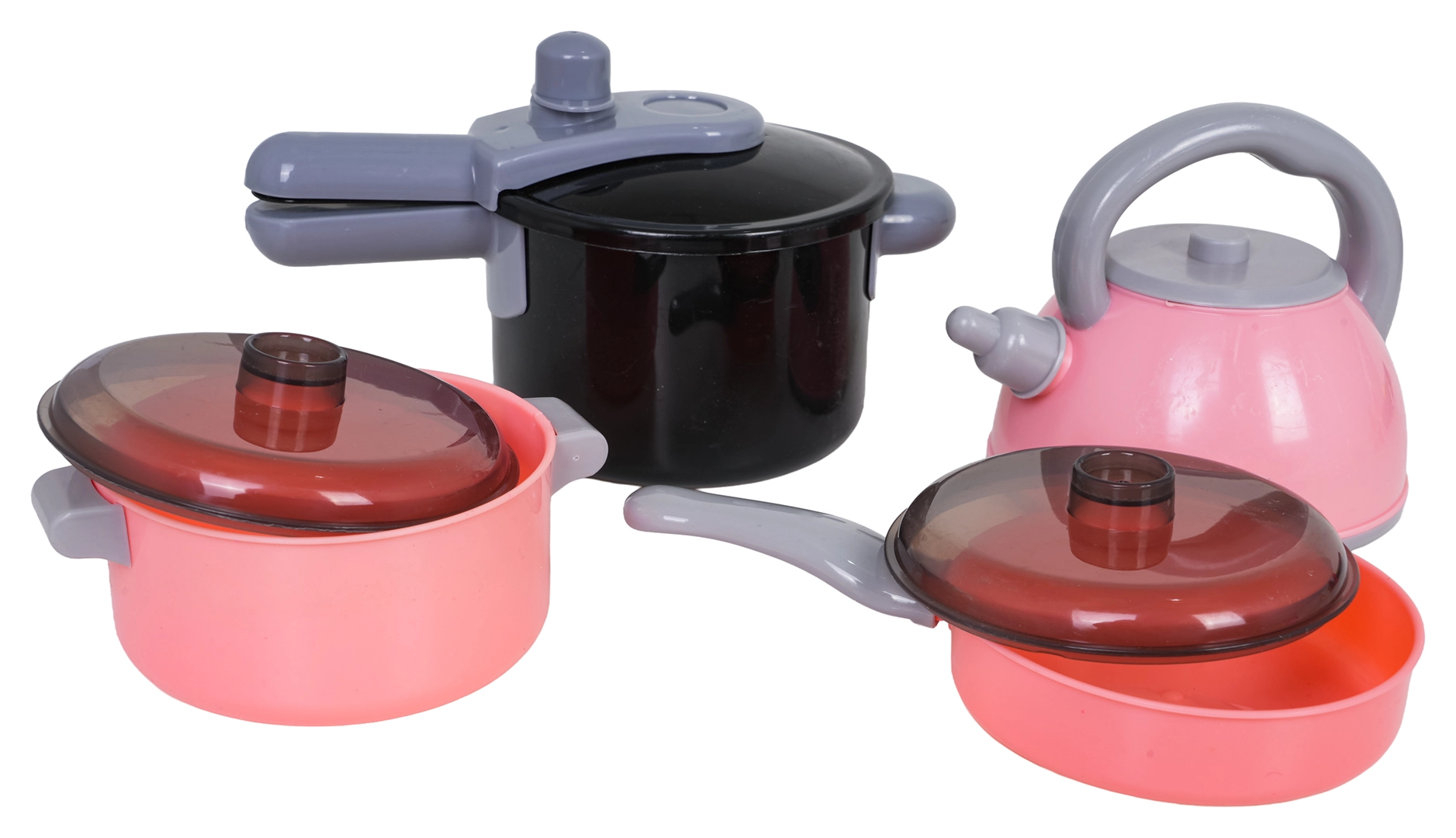 Een pan, koekenpan met deksel, snelkookpan en waterkoker worden aangevuld met een compacte grill. Kinderen kunnen hun favoriete “gerechten” koken, stoven en grillen.