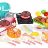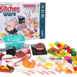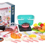 De set bevat een inductiekookplaat op 3× AA (niet inbegrepen) met temperatuurweergave en touchbediening; verder een grill, serviesset (speelgoed-waterkoker, snelkookpan, koekenpan, kookpan), serveersets (kommetjes, bordjes, bestek, stokjes), snij-etenswaren met klittenband, pizza met pizzasnijder, spiesen en veel meer. Alles wordt aangevuld met een boodschappenmand en serveerblad voor realistisch spel.