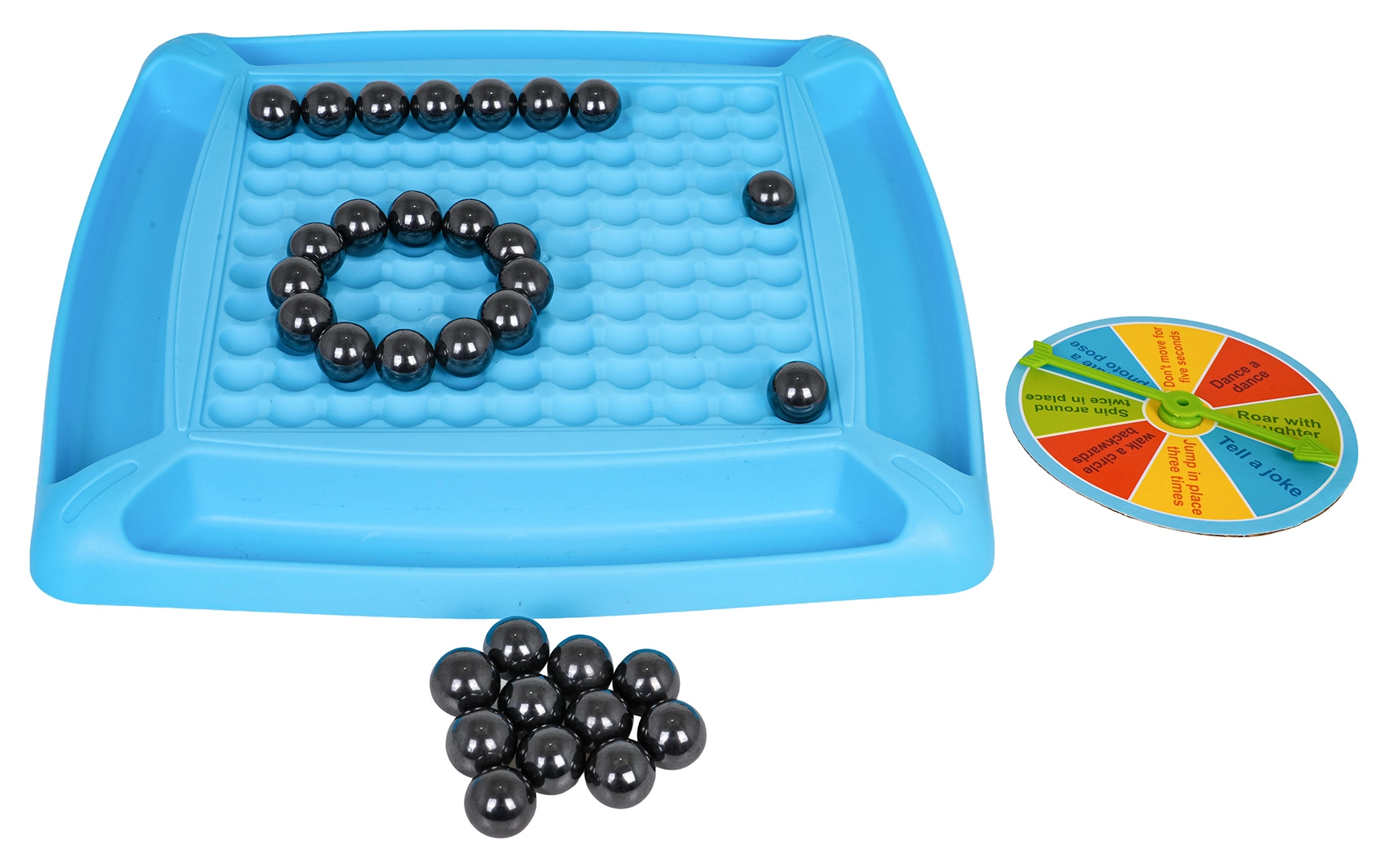 Een leuke magnetische tafelspel voor twee spelers vanaf 8 jaar die handigheid, aandacht en creatief denken ontwikkelt. De set bevat 32 magnetische kogeltjes, een uitdagingswiel en een spelbord met drie spelvarianten voor spannende en steeds weer leuke speelrondes.