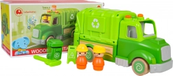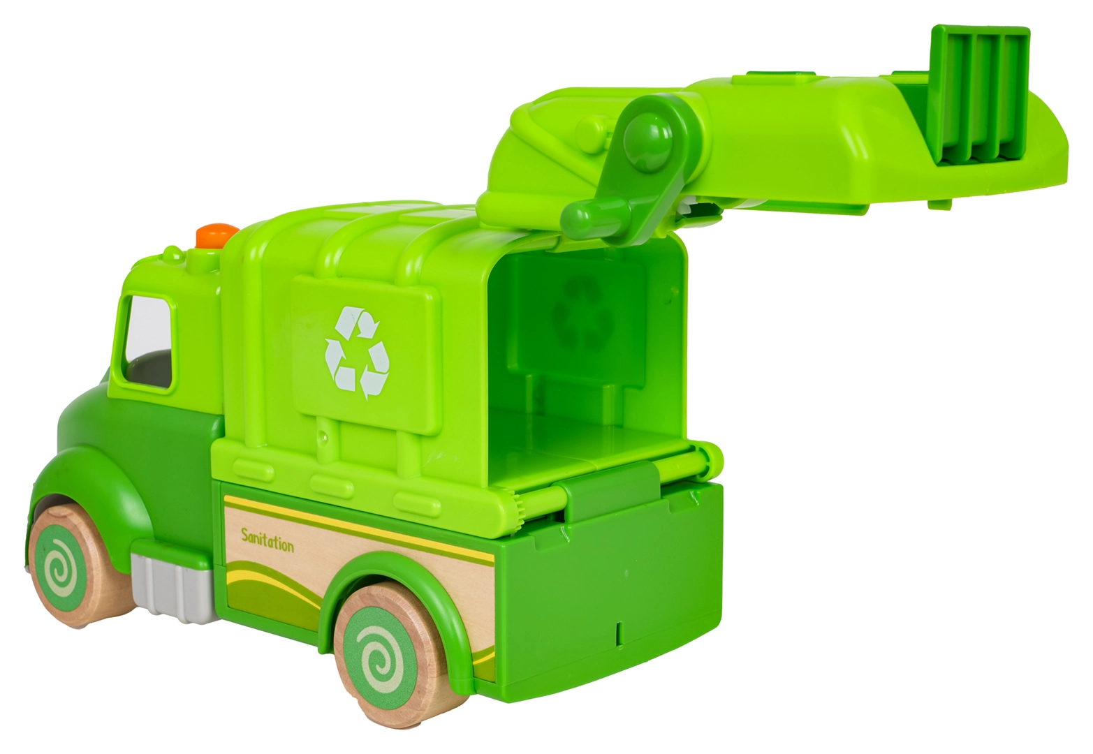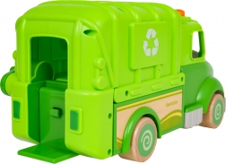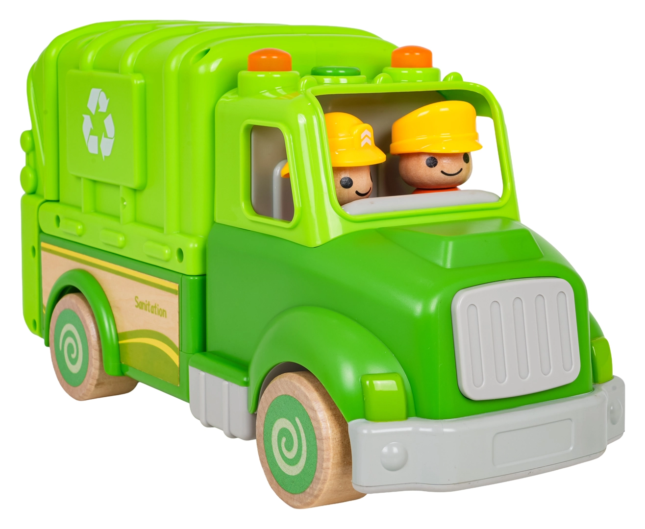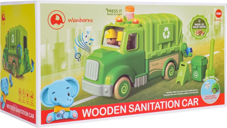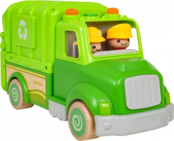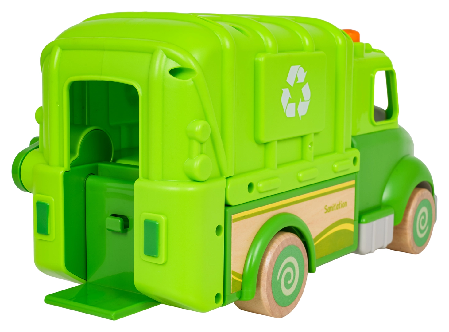Ontdek het leuke spel van afval scheiden met de houten vuilniswagen voor de allerkleinsten. Gemaakt van duurzaam hout en kunststof, met licht- en geluidseffecten, een openende container en een werkende hef voor de afvalbak. Inclusief 2 figuurtjes en een praktische set accessoires voor realistisch speelplezier.