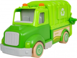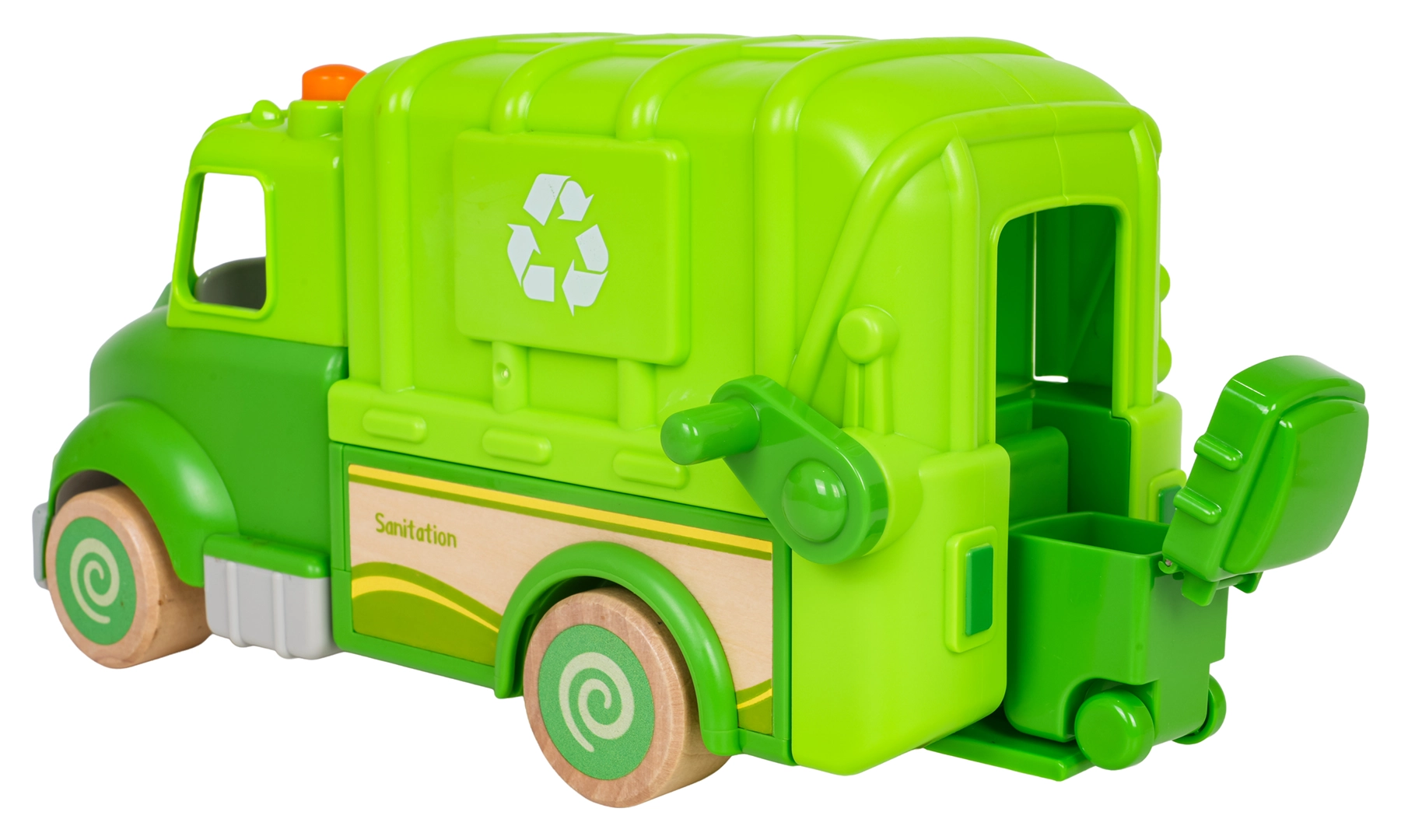 Kinderen zullen dol zijn op de handmatige hef voor de afvalbak, de openende en kantelbare container en de mogelijkheid om het afval te “lossen”. In de doos zitten een afvalbak, een waarschuwingsbord, een bezem en twee figuurtjes die de speelscenario’s uitbreiden. De wagen heeft ook een oogje om een koordje te bevestigen, zodat hij makkelijk voortgetrokken kan worden.