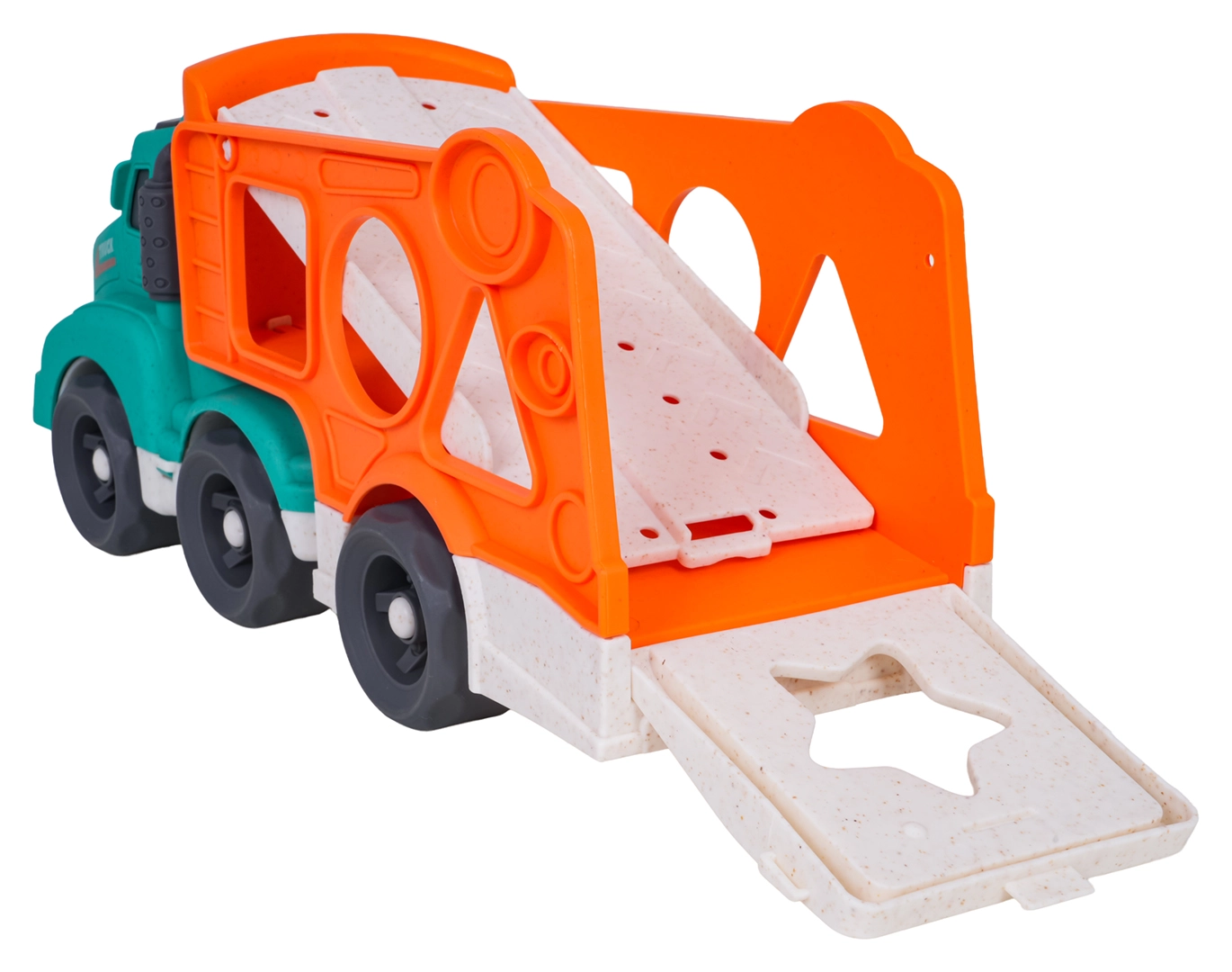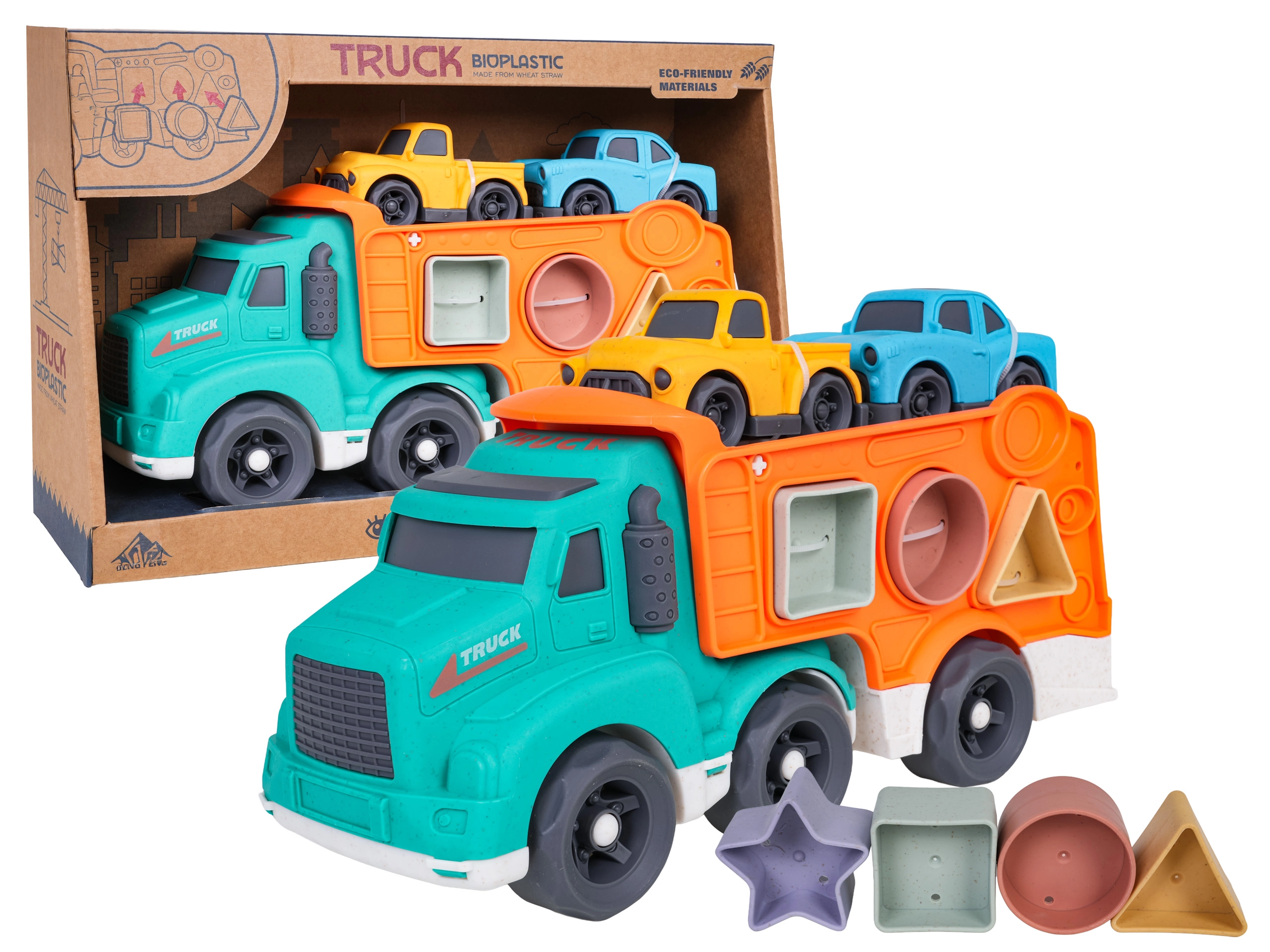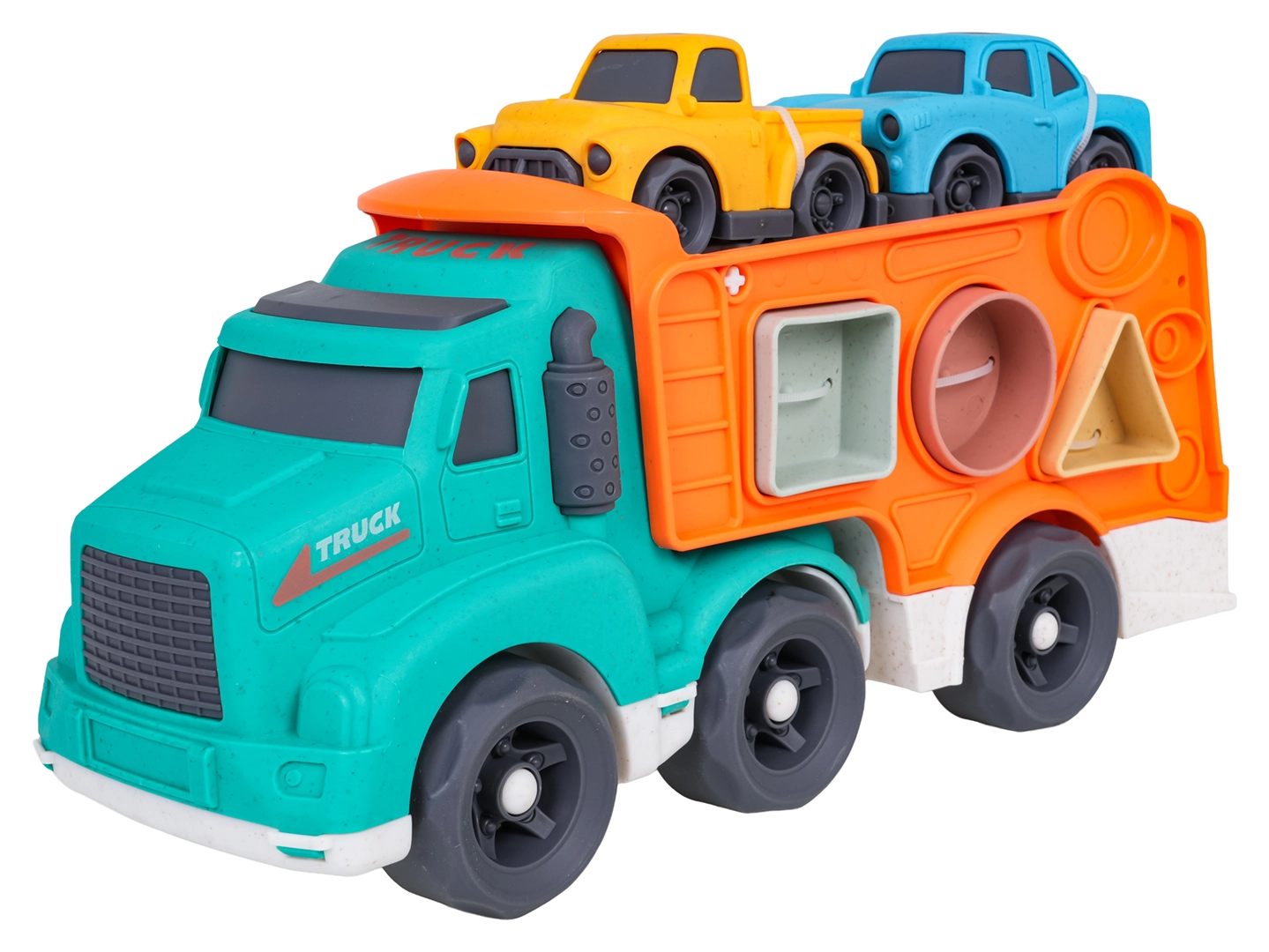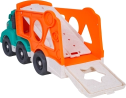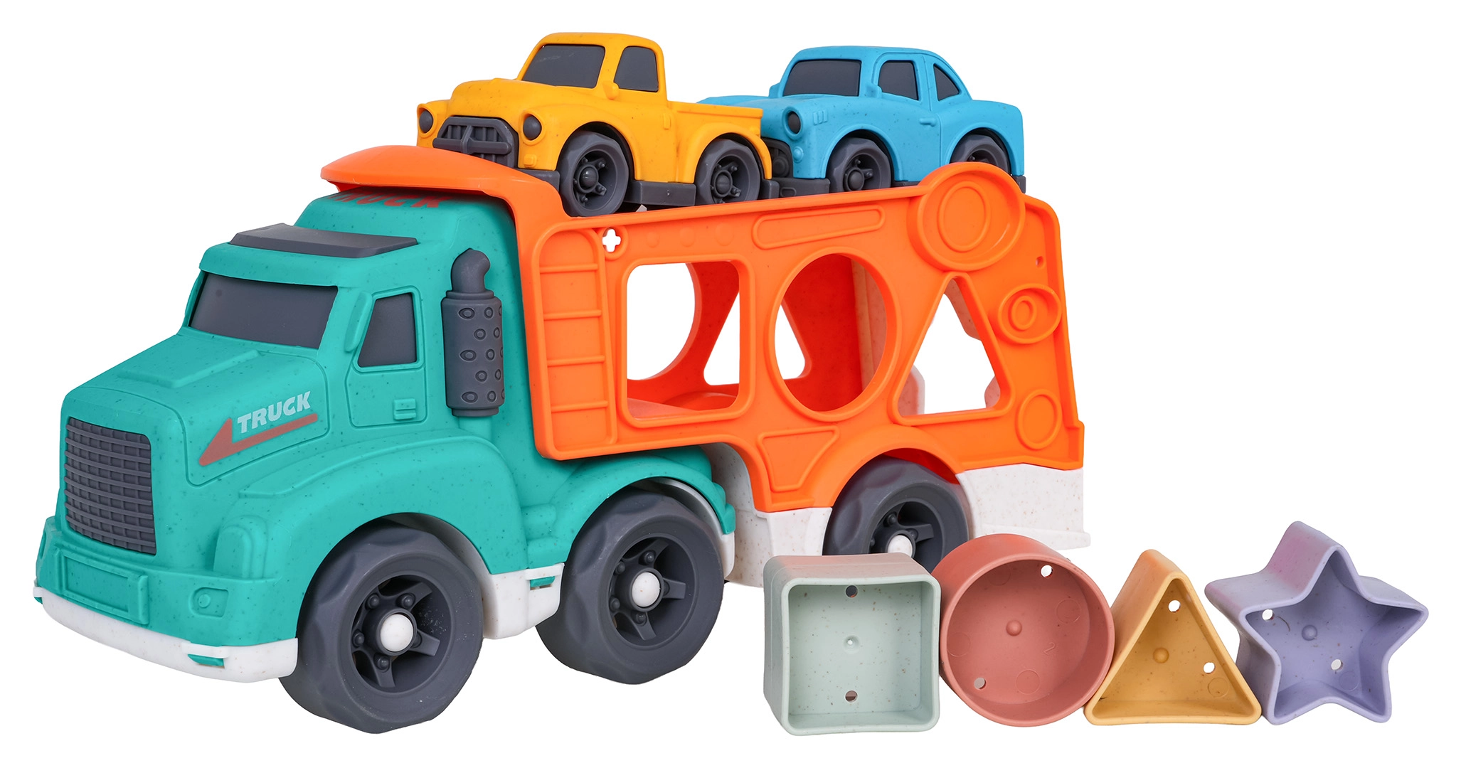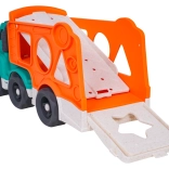 Kleurige bergingswagen van bioplastic die een autotransporter en een vormensorteerder in één speeltje combineert. Bevat 2 autootjes en 4 vormen, heeft rijdbare wielen, een duurzame constructie en een afkoppelbare aanhanger. Geschikt voor kinderen vanaf 18 maanden, veilig en ecologisch – ideaal voor binnen en buiten.