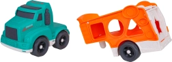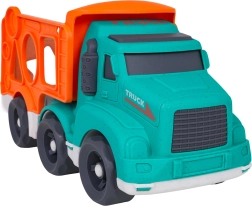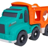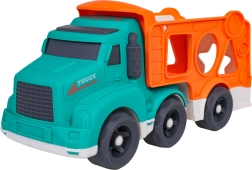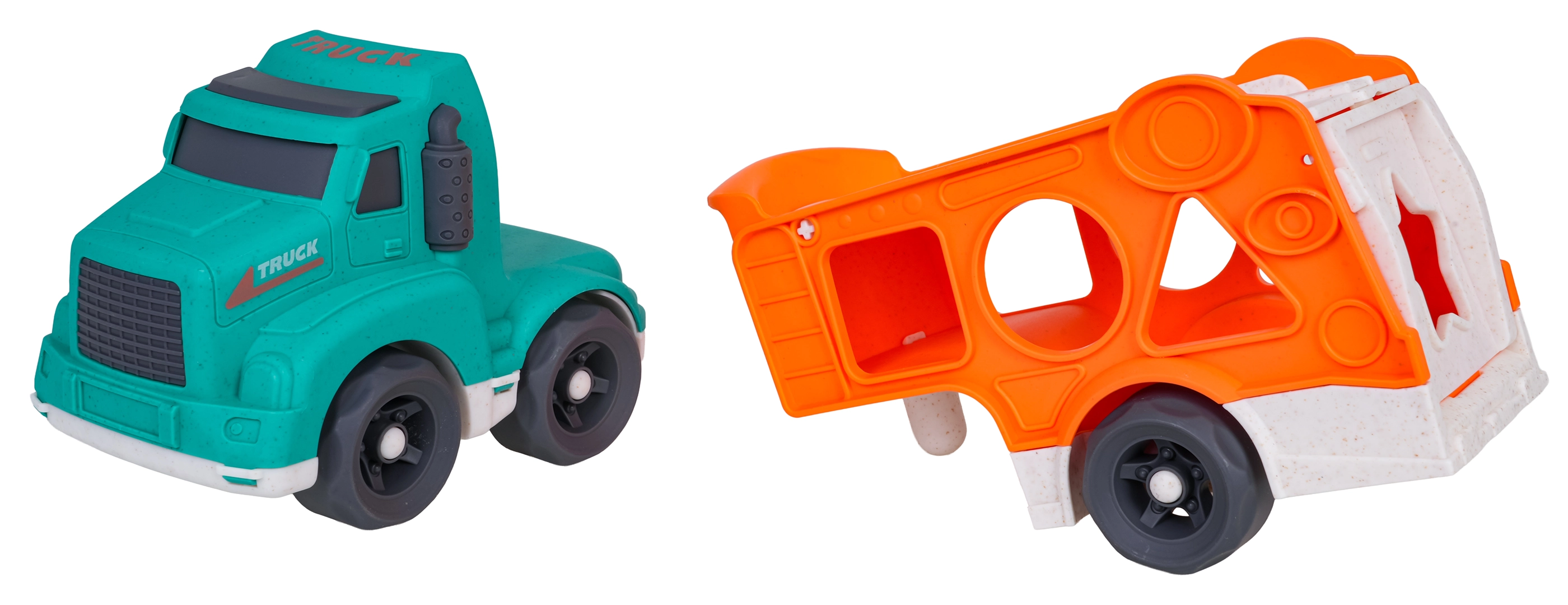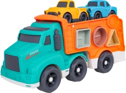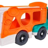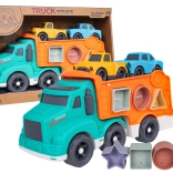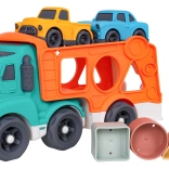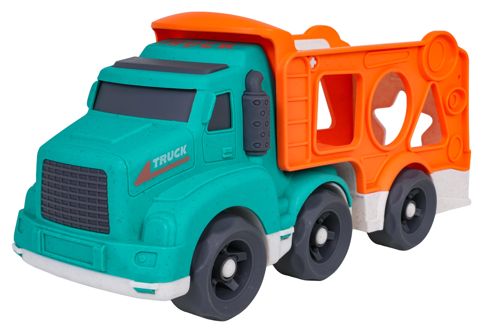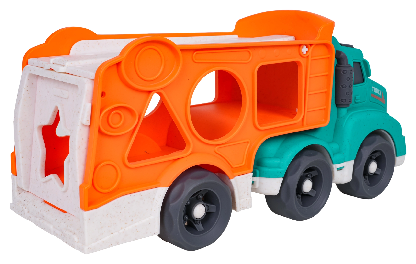 Kleurige bergingswagen van bioplastic die een autotransporter en een vormensorteerder in één speeltje combineert. Bevat 2 autootjes en 4 vormen, heeft rijdbare wielen, een duurzame constructie en een afkoppelbare aanhanger. Geschikt voor kinderen vanaf 18 maanden, veilig en ecologisch – ideaal voor binnen en buiten.