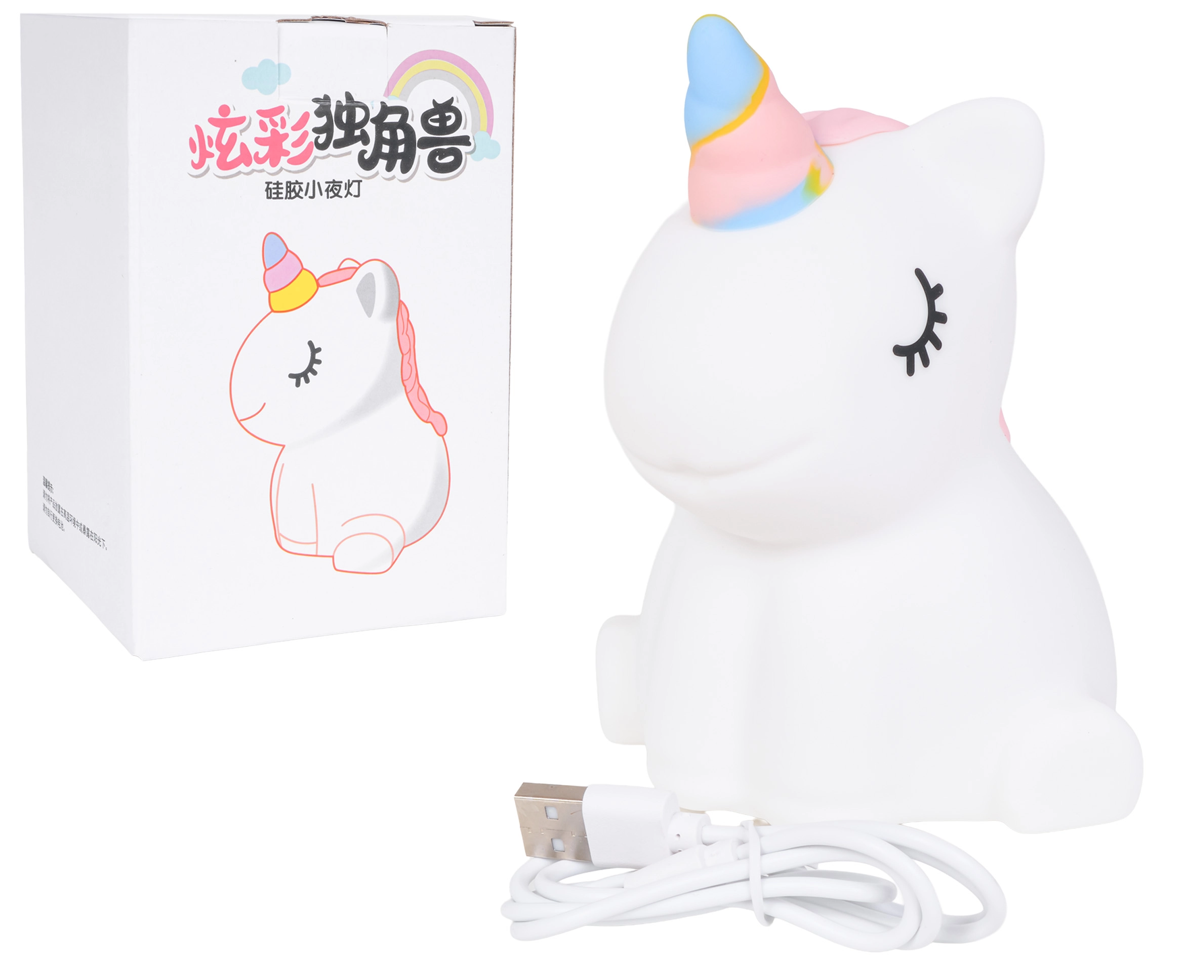 Schattig nachtlampje in de vorm van een eenhoorn van zachte BPA-vrije siliconen dat warm en zacht licht geeft en een gezellige en veilige sfeer in de kinderkamer creëert. Biedt 3 helderheidsniveaus (10%, 50%, 100%), touchbediening over het hele oppervlak en opladen via USB‑C met een ingebouwde 3,7 V-accu.