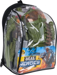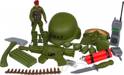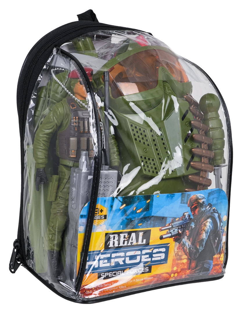 transparante rugzak, helm, bril met masker, mes, walkietalkie, fluit, veldfles, telefoon, bijl, verrekijker, geweer met schietgeluid, riem met munitie, 4 granaten, soldatenfiguur met beweegbare ledematen, explosief, identificatieplaatje