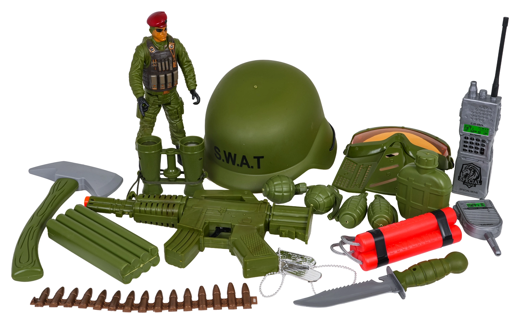 • 16-delige uitrusting voor realistisch spel – helm, bril met masker, walkietalkie, verrekijker, riem met munitie en nog veel meer.
