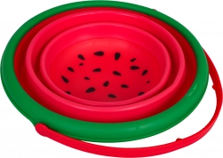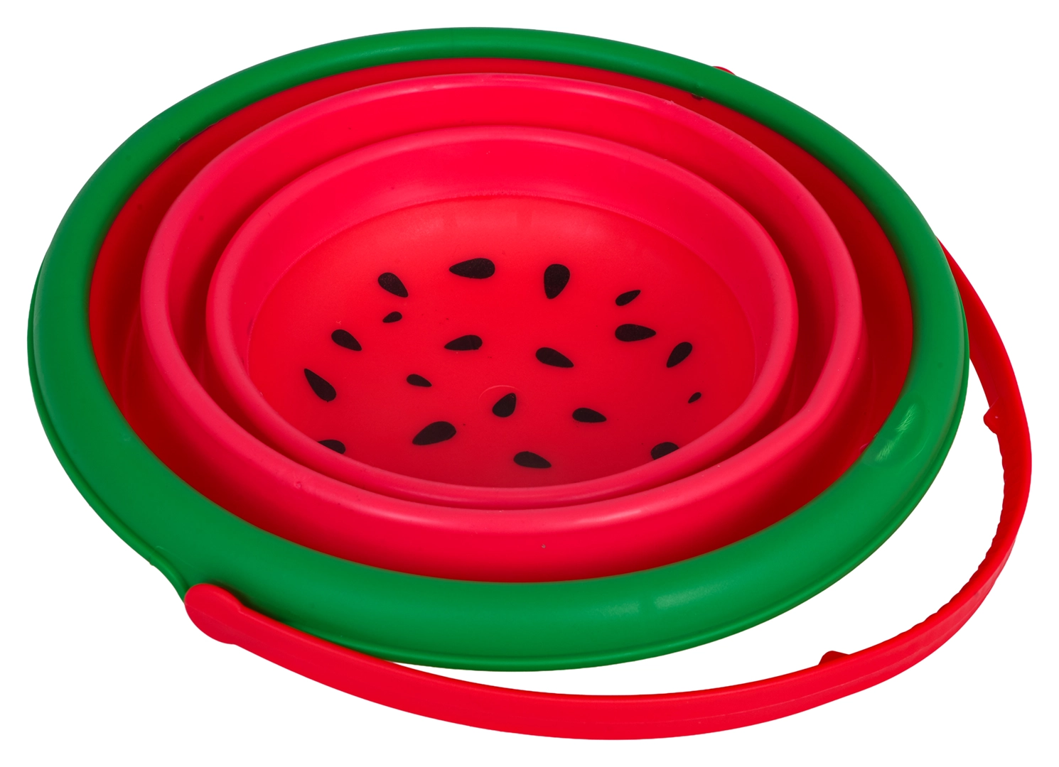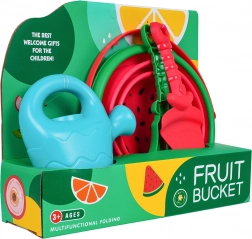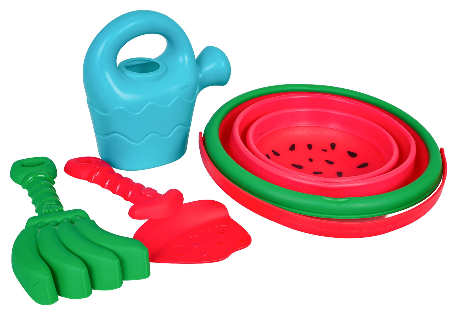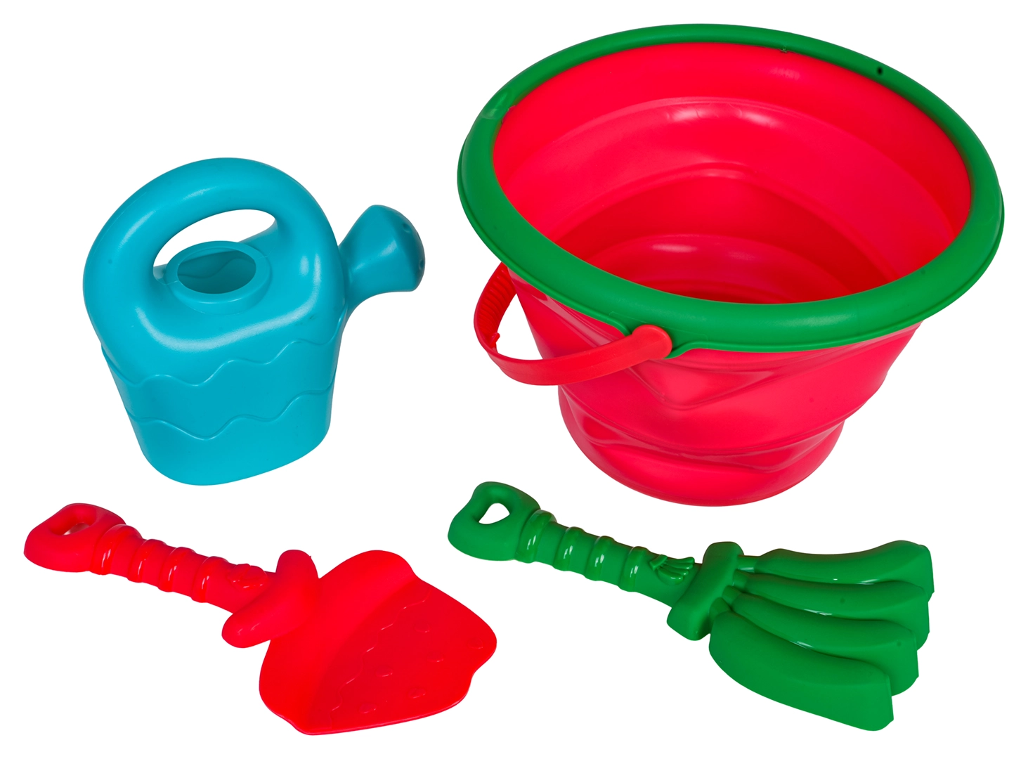Vrolijke zandset voor kinderen vanaf 3 jaar met een opvouwbare emmer, schep, hark en gieter. Licht en veilig ontwerp van kunststof en siliconen, ideaal voor in de zandbak en op het strand. De opvouwbare emmer bespaart ruimte in de rugzak en is gemakkelijk mee te nemen.