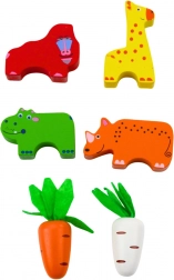 - houten auto met afneembaar dak, 6 worteltjes (ca. 8 cm), 8 magnetische wormpjes (ca. 5,5 cm), 2 figuurtjes met magneet (ca. 6,5 cm), 6 dieren voor de sorteerder