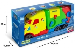 Ontdek de robuuste vuilniswagen uit de serie MAGIC TRUCK BASIC, die uitblinkt met realistische functies en levendige kleuren. De wagen heeft een hefbare container, een te openen achterklep, een transportband voor het verplaatsen van lading en in de set zitten ook 2 afvalbakken. Dankzij het duurzame, veilige materiaal en de vele bewegende onderdelen stimuleert hij de fijne motoriek, de fantasie en het leren afval te scheiden. Lengte van de wagen 59,5 cm. Geschikt vanaf 3 jaar.