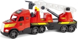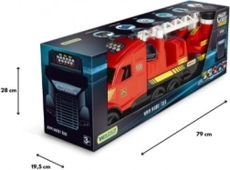 De grote brandweerwagen uit de Magic Truck Action-serie maakt elke kleine held blij. Hij biedt een uitschuifbare en beweegbare ladder met bakje, een werkend pompje en slang met watertank, draaielementen om de straal te richten en een stevige, duurzame constructie van veilige materialen. De aanhanger is stuurbaar en afneembaar, kan op twee manieren worden gekoppeld en heeft een totale lengte tot ca. 80 cm.