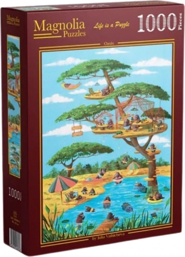 Ontdek het plezier van puzzelen met de MAGNOLIA Oase met 1000 stukjes. Dankzij het optimale formaat na het leggen is hij ideaal om in te lijsten of om opnieuw te leggen. Het oase-motief brengt een rustgevende sfeer en is perfect als cadeau voor volwassenen en oudere kinderen.