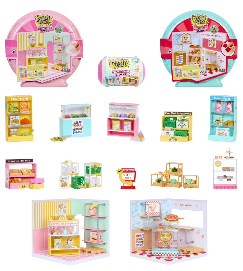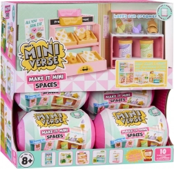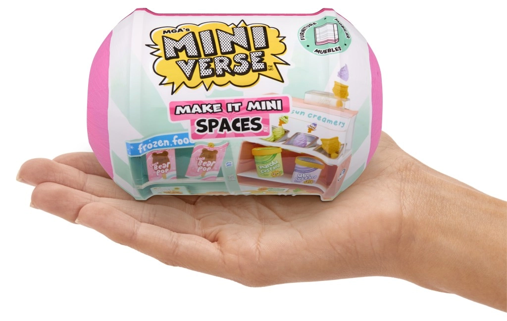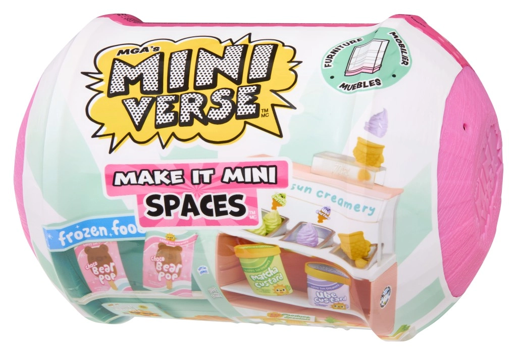 Ontdek de wereld van miniaturen met de collectie MGA’s Mini Verse Make It Mini Spaces – capsules vol verrassingen die je helpen je miniatuurscènes te creëren en tentoon te stellen. In elke verpakking vind je verschillende meubelonderdelen en accessoires voor themaruimtes zoals een ijssalon, bakkerij, saladebar of vriesvitrine. Dankzij modulaire rekken, stapelbare stands en detailrijke accessoires maak je eenvoudig originele minichoekjes om mee te spelen en om te showen.
