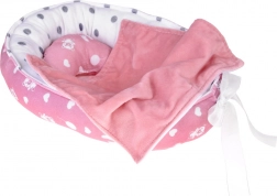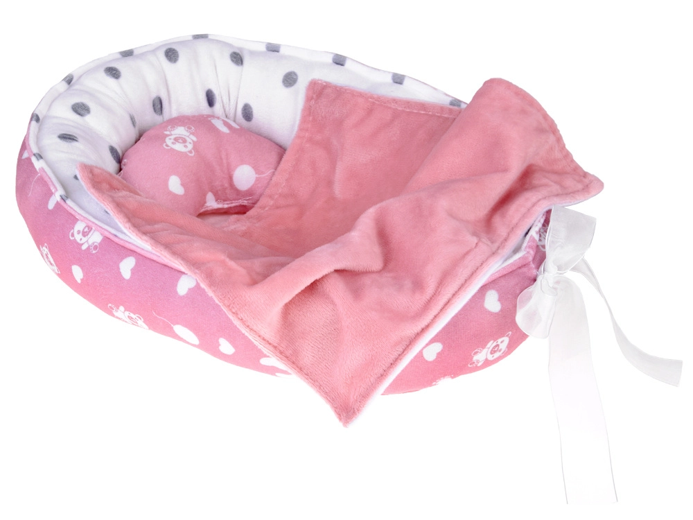 De textielen wieg met stippenvoering en strik biedt de pop een knus plekje. Kinderen kunnen het gemakkelijk dragen en het baby’tje overal en altijd te slapen leggen.