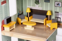 De praktische samenstelling voor het hele poppenhuis omvat de inrichting van woonkamer, badkamer, slaapkamer, keuken en eetkamer. De onderdelen zijn afgestemd op kleinere poppen en passen ook in kleinere ruimtes – en functioneren net zo goed als een losse set voor vrij spel.