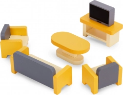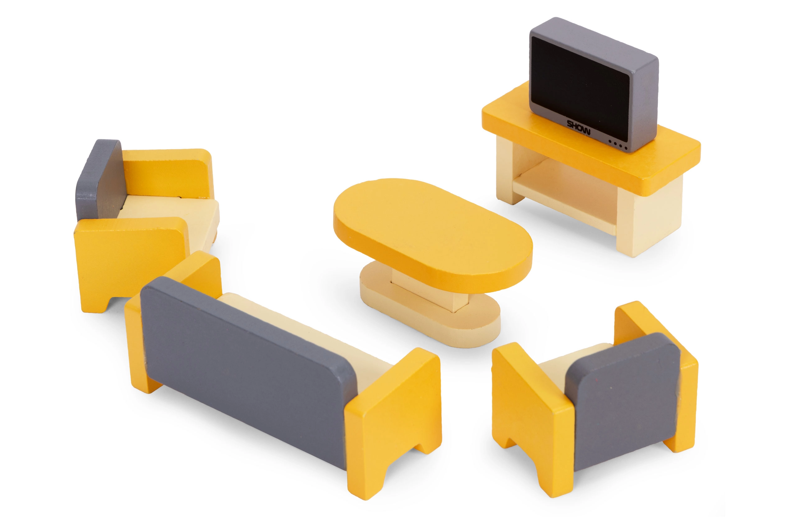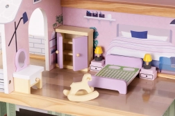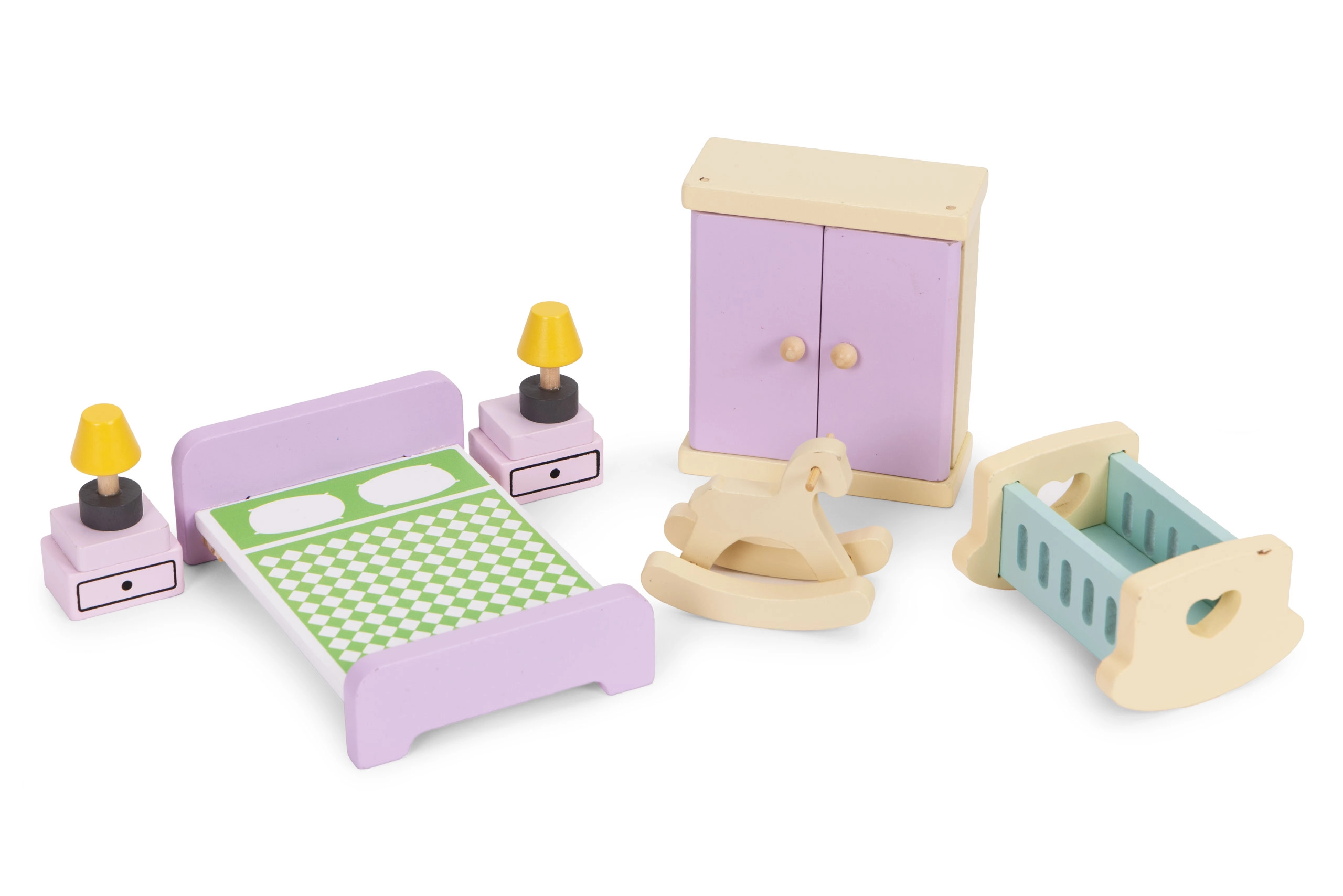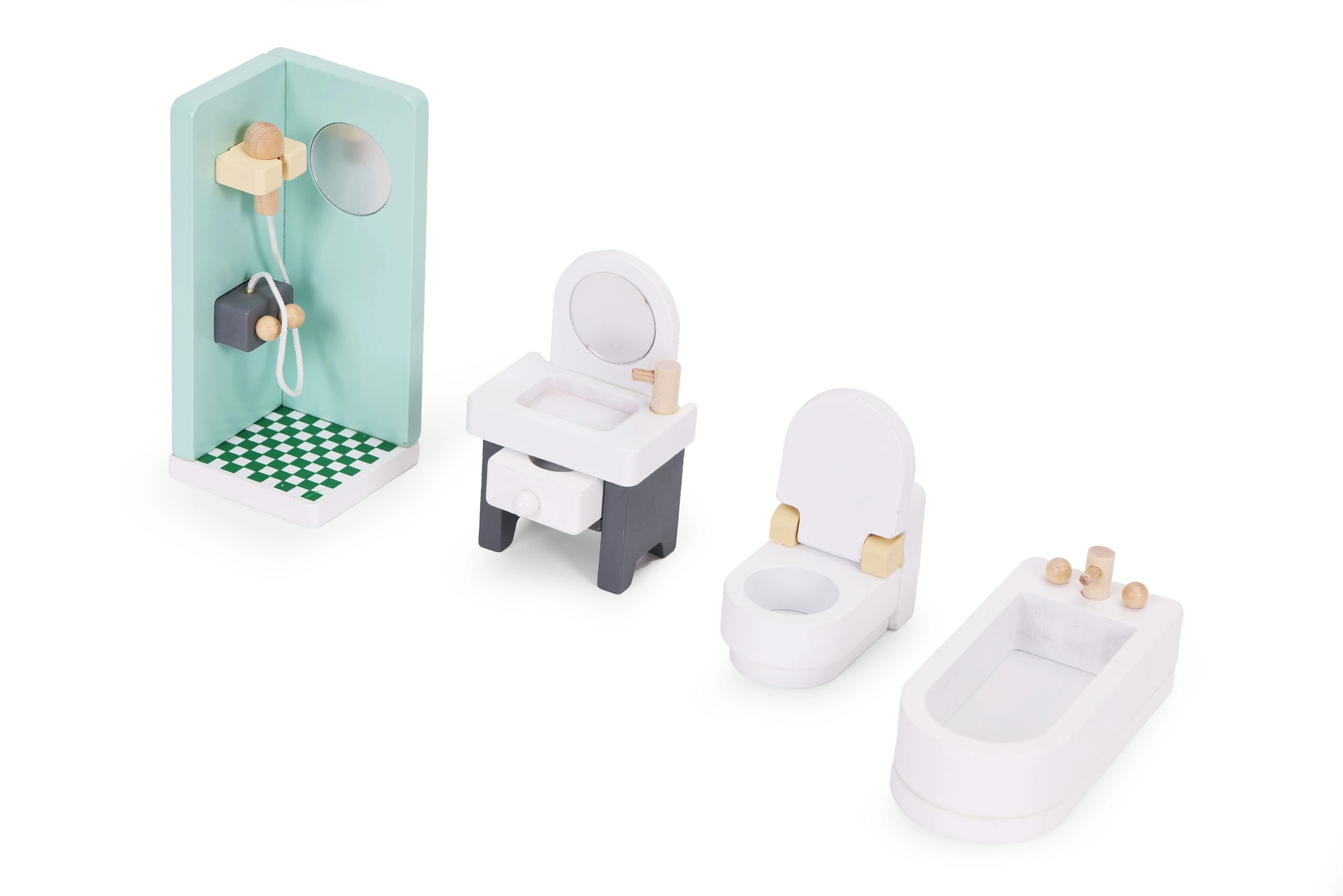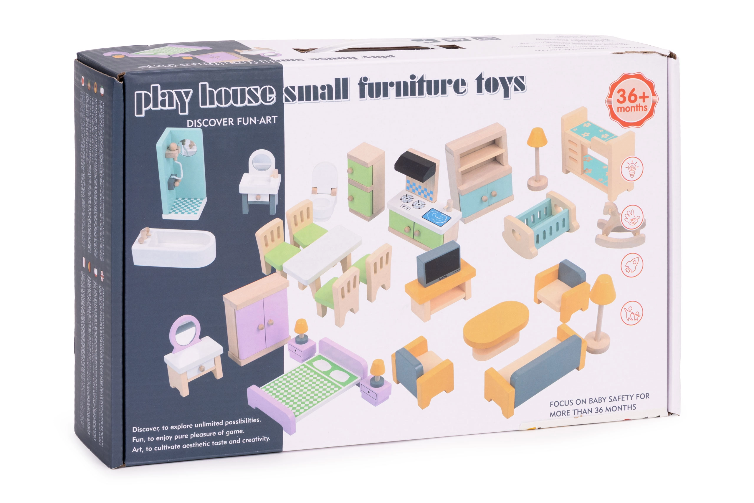 Stijlvolle set van 30 houten meubelstukken voor de inrichting van woonkamer, slaapkamer, keuken, badkamer en eetkamer. Ideaal voor kleinere poppen en compacte poppenhuizen. Veilige afgeronde randen, duurzame afwerking en eenvoudig onderhoud ondersteunen creatief spel, samenwerking en de ontwikkeling van de fijne motoriek bij kinderen vanaf 3 jaar.