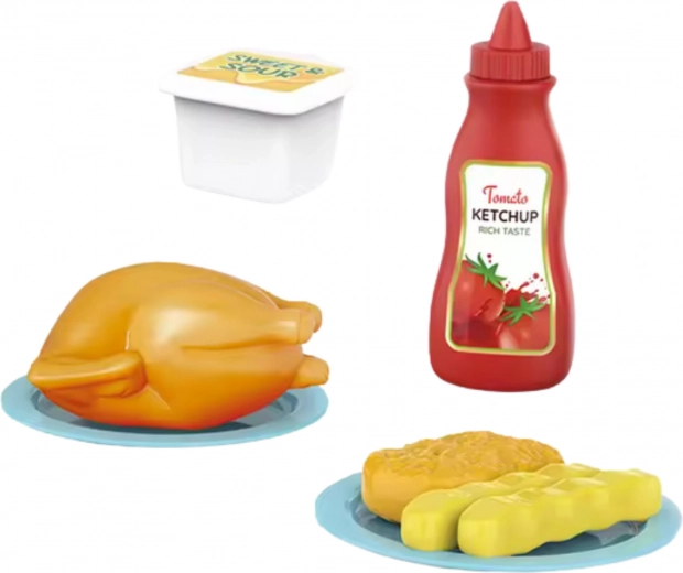 In de verpakking: interactieve magnetron, plastic kip, 2× frietjes, 1× nugget, bekertje met saus, ketchupfles, 2 bordjes.