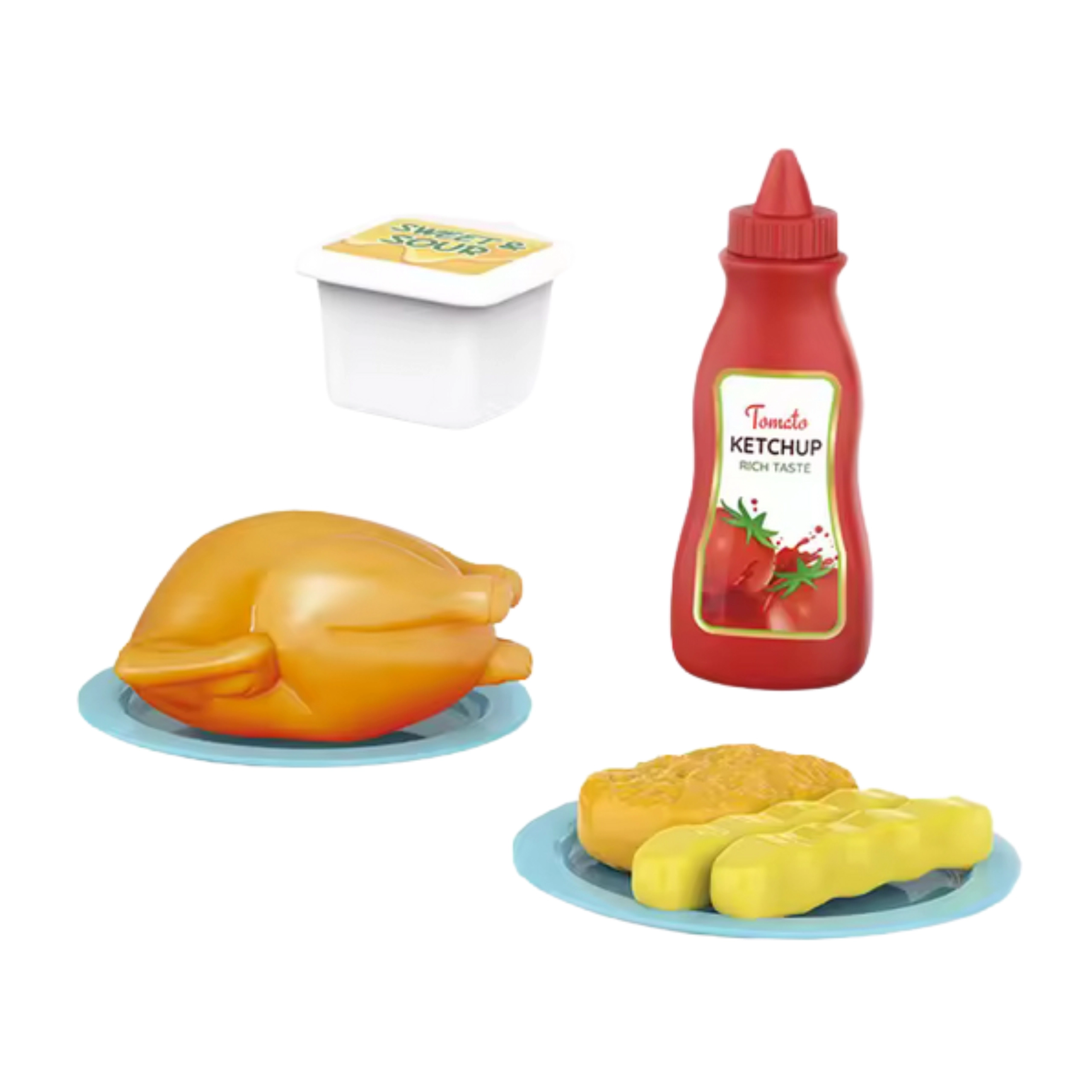 • Rijke accessoires inclusief plastic kip, frietjes, nugget en bordjes.