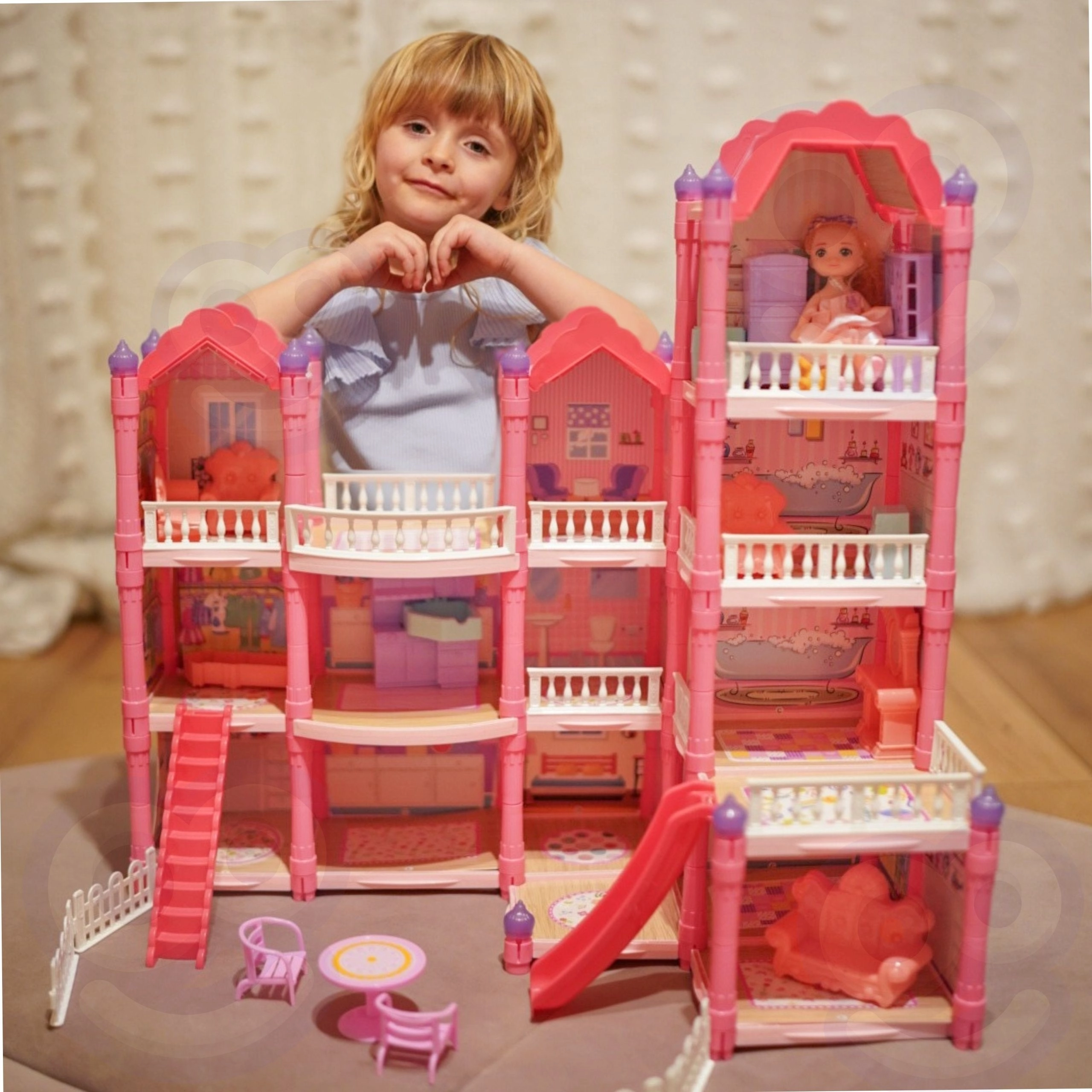 Ontdek het betoverende drie verdiepingen tellende poppenhuis met een roze dak, rijke inrichting en nachtverlichting. De set biedt 296 onderdelen, inclusief schattige meubels, accessoires en een pop, zodat kinderen elke kamer zelf kunnen inrichten. Glijbaan, trap en terras zorgen voor extra plezier en stimuleren creativiteit, verbeeldingskracht en fijne motoriek.