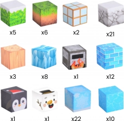 6× blokje (ijspatroon); 14× blokje (steenpatroon); 3× blokje (houtpatroon); 16× blokje (bladpatroon); 18× blokje (blauw ijspatroon); 3× blokje (pinguïnpatroon); 1× blokje (ijsbeerpatroon); 13× blokje (steenpatroon met sneeuw); 1× blokje (steentje/oven-patroon); 1× blokje (zonder gespecificeerd patroon)