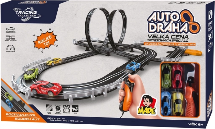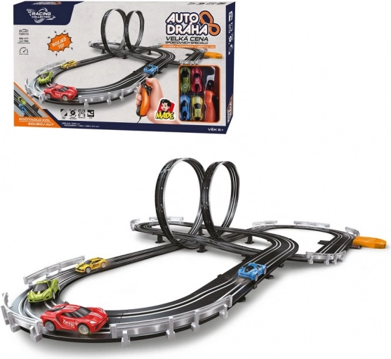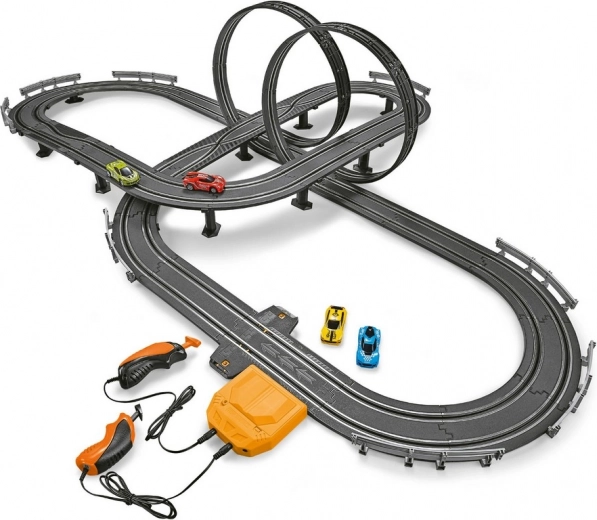 Geniet van spannende races met een racebaan van in totaal 700 cm met twee banen, loopings en steile bochten. Inclusief 2 autootjes met 4 verwisselbare carrosserieën, 2 controllers en de mogelijkheid om te voeden met AA-batterijen of een netadapter (meegeleverd). Ideaal vermaak voor kinderen vanaf 6 jaar.
