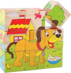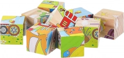 Houten puzzel met blokjes ontwikkelt via spel logisch denken, geduld en fijne motoriek. Van 9 blokjes maak je 6 verschillende boerderijafbeeldingen met dieren. Lichte, gladde en veilige houten blokken met kleurrijke illustraties liggen prettig in kleine handjes en ondersteunen het herkennen van vormen en kleuren.