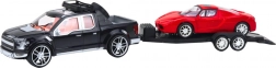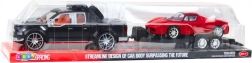 Zwarte pick-up met aanhanger en rode sportwagen vormen een realistische set voor thematisch spel.