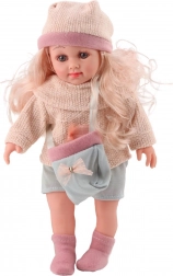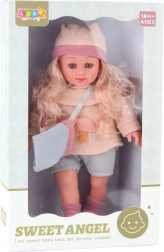 De schattige pop Sweet Angel met een hoogte van 36 cm betovert met haar gedetailleerde afwerking en zachte uitstraling. Ze heeft lang blond haar, realistische gelaatskenmerken en een moderne outfit in pastelkleuren: een gebreid truitje met paddenstoelenmotief, korte blauwe short, roze sokken, een crèmekleurige muts en een handtas met strikje. Perfect voor rollenspel, het stimuleren van de fantasie en als verzamelobject.