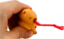 De bruine capibara met rode toeter is gemaakt van een heerlijk zacht en elastisch materiaal dat fijn in te drukken is en ontspanning bevordert. Bij het indrukken activeert een piepgeluid en schuift er een toeter uit de snuit, wat dit speeltje zowel tot een geweldige antistress-gadget als tot originele groepspret maakt.