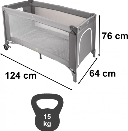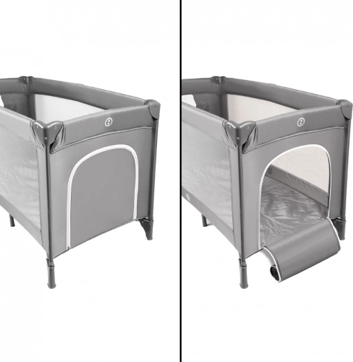 Het zijraam met rits vergemakkelijkt de toegang voor ouders en maakt zelfstandig uitstappen voor kinderen mogelijk. Binnenin bevindt zich een matras met klittenbandbevestiging die de bodem stabiliseert en het slaapcomfort verhoogt. Ingeklapt is de wieg zeer compact en past in de kofferbak; de meegeleverde tas met handgrepen vergemakkelijkt dragen en opbergen.