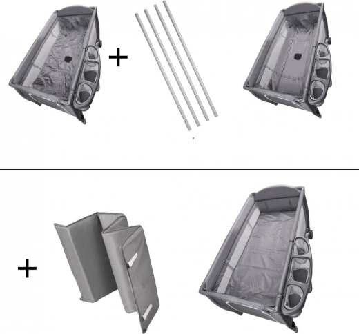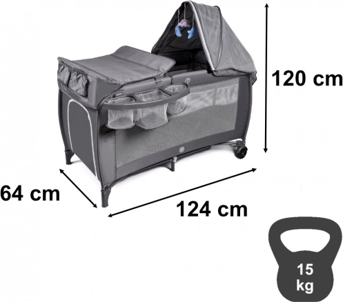 Voor ouders is er een aankleedblad en praktische organizers voor luiers en spulletjes, zodat je alles altijd bij de hand hebt. Het snelle vouwmechanisme, wielen met vergrendeling en de draagtas maken verplaatsen en opbergen eenvoudig – ideaal voor op vakantie, bij grootouders en in kleine appartementen.