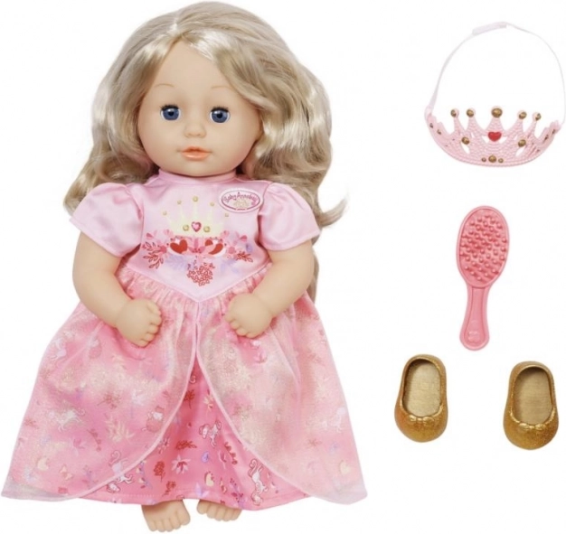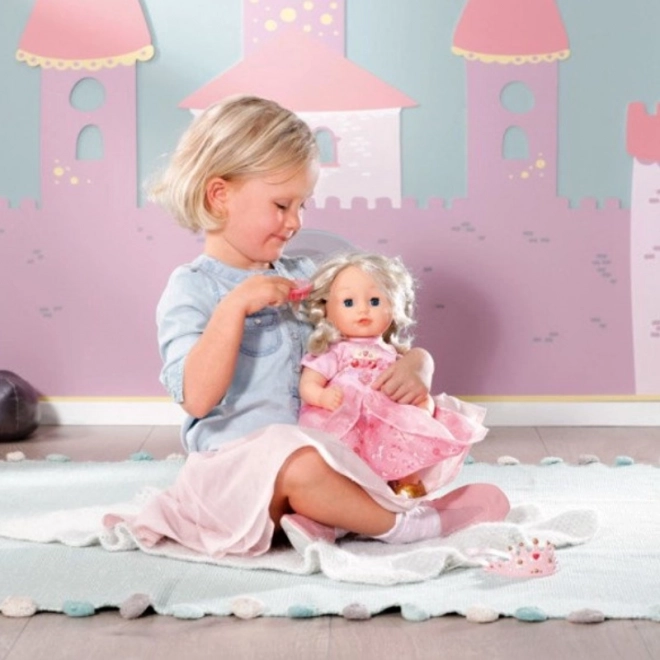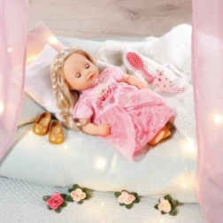 De Baby Annabell Kleine Zoete Prinses pop is gemaakt voor kleine prinsesjes met een fantasie. Wanneer je haar een kus geeft, antwoordt ze met kusgeluiden en blozen haar wangen. Daarbij sluit ze haar stralende blauwe ogen. Met haar kwalitatieve haren en eigen borstel kun je prachtige kapsels maken. Het zachte lichaam van deze pop is ideaal om mee te knuffelen en te ontspannen na een dag vol spel.
