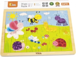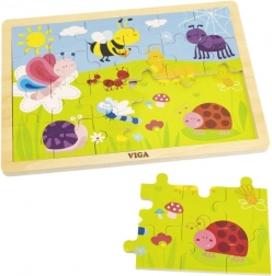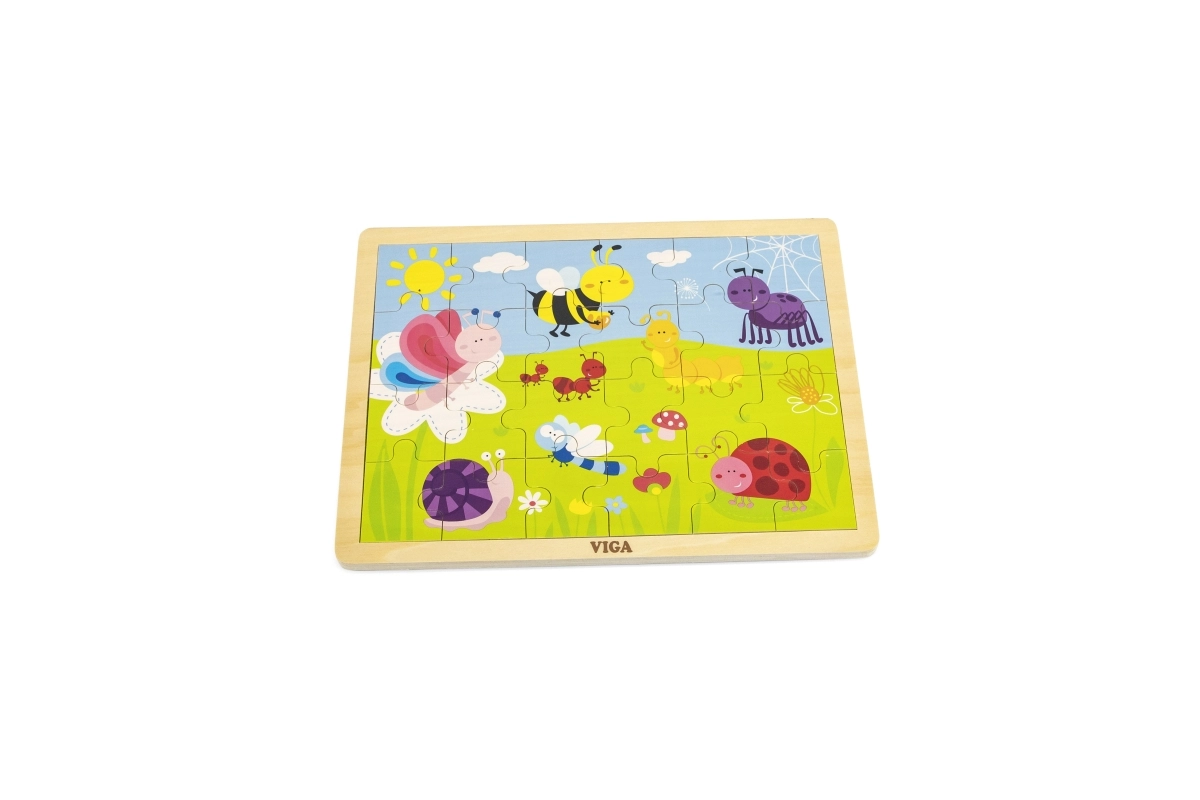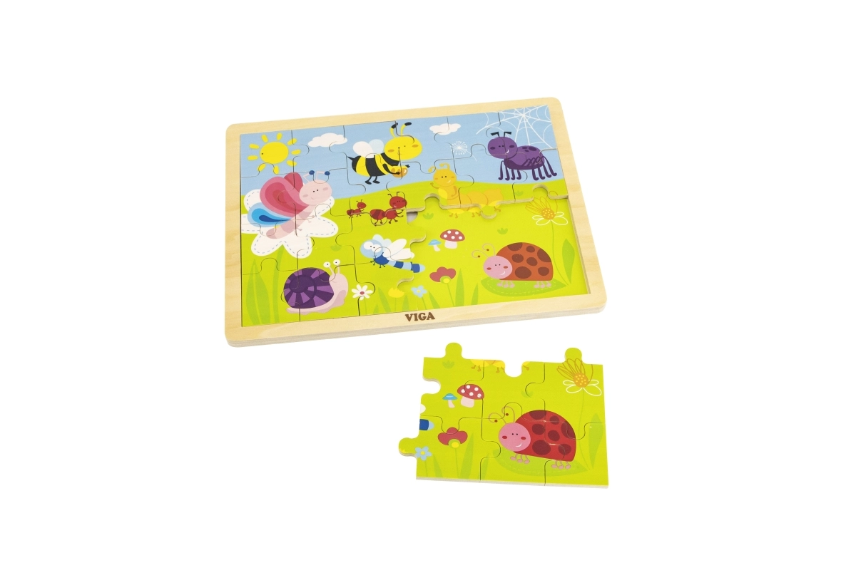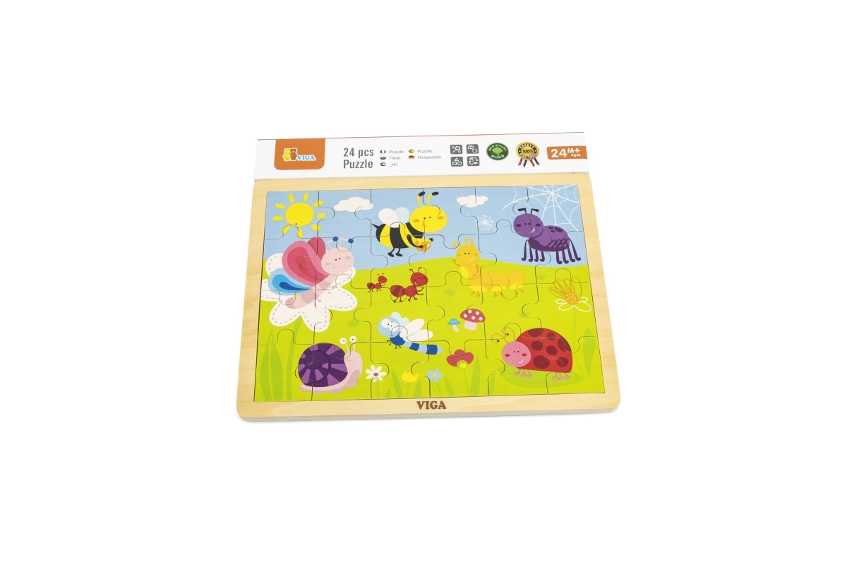 Ontdek de kwalitatieve houten puzzel van VIGA met een weide vol kleurrijke beestjes – bij, vlinder, lieveheersbeestje en slak. Het leggen van 24 stevige stukjes in een lijst bevordert geduld en concentratie, terwijl kinderen vormen, kleuren en details van de vriendelijke illustratie leren herkennen.