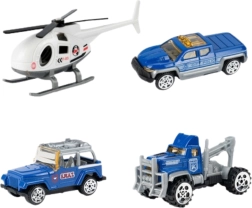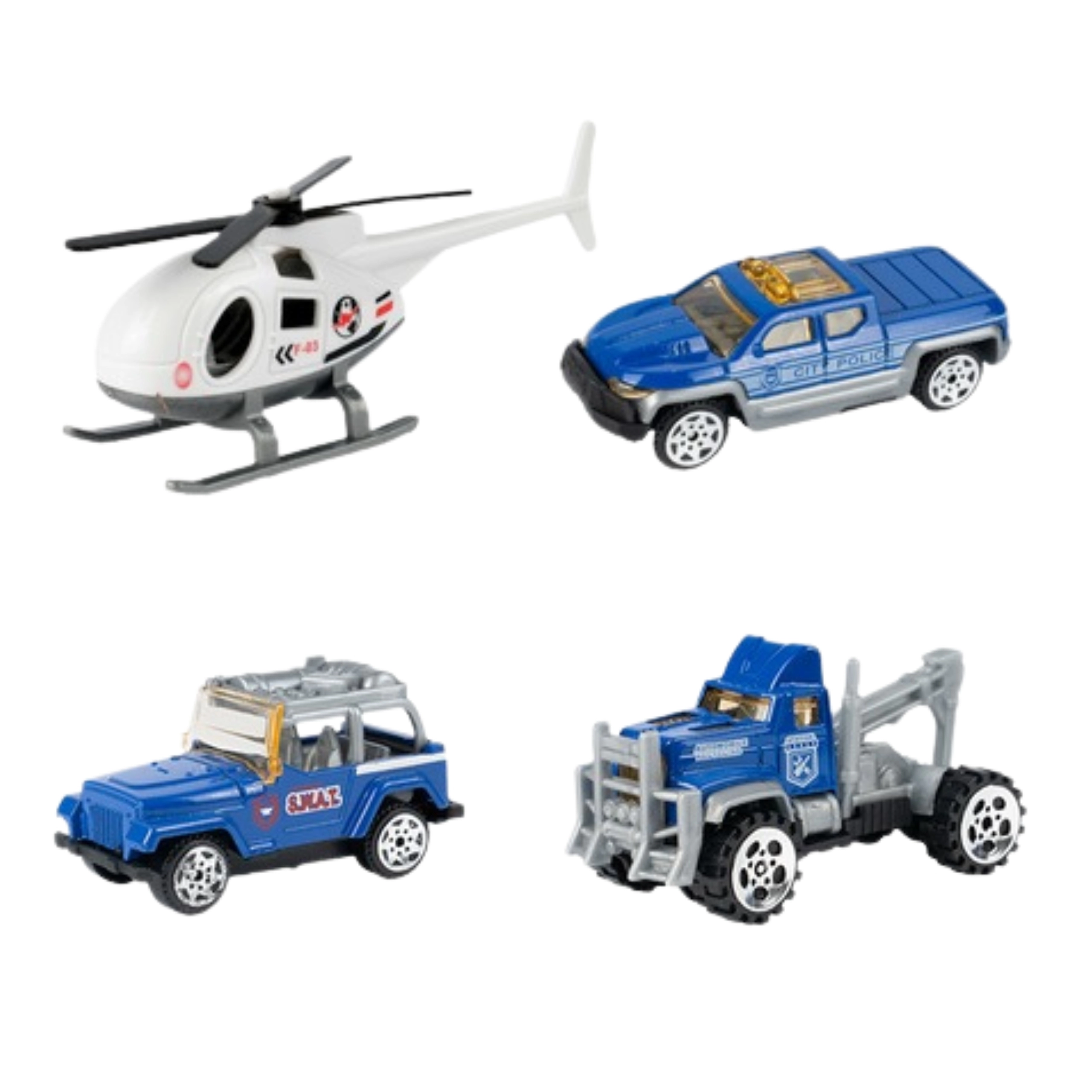 - 3 metalen politieauto’s (willekeurige modellen) + 1 politiehelikopter