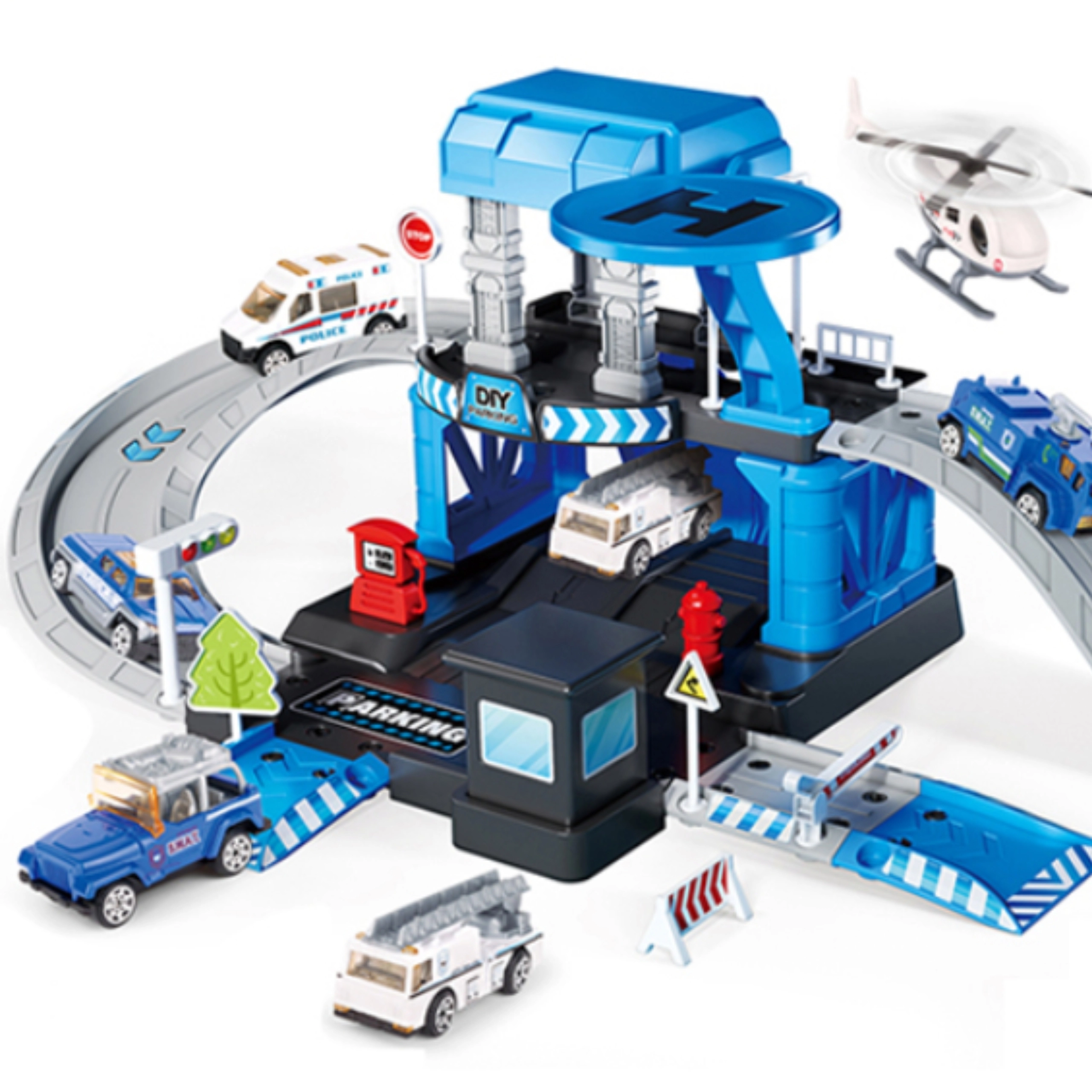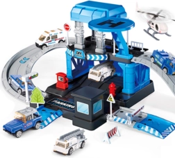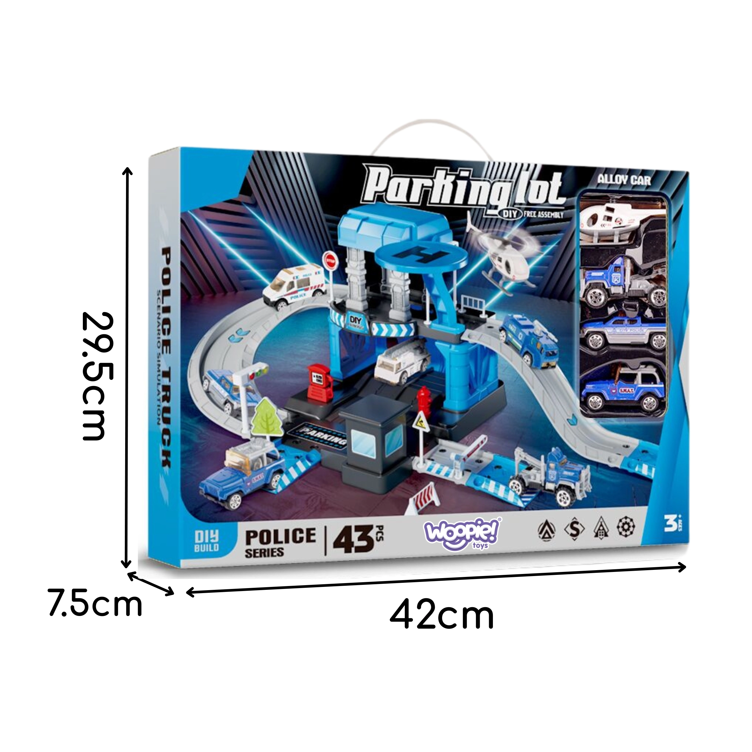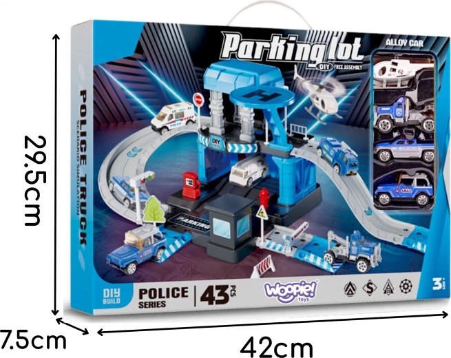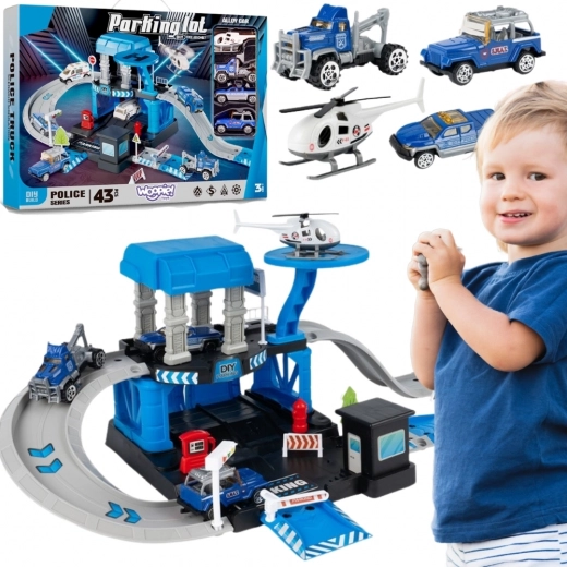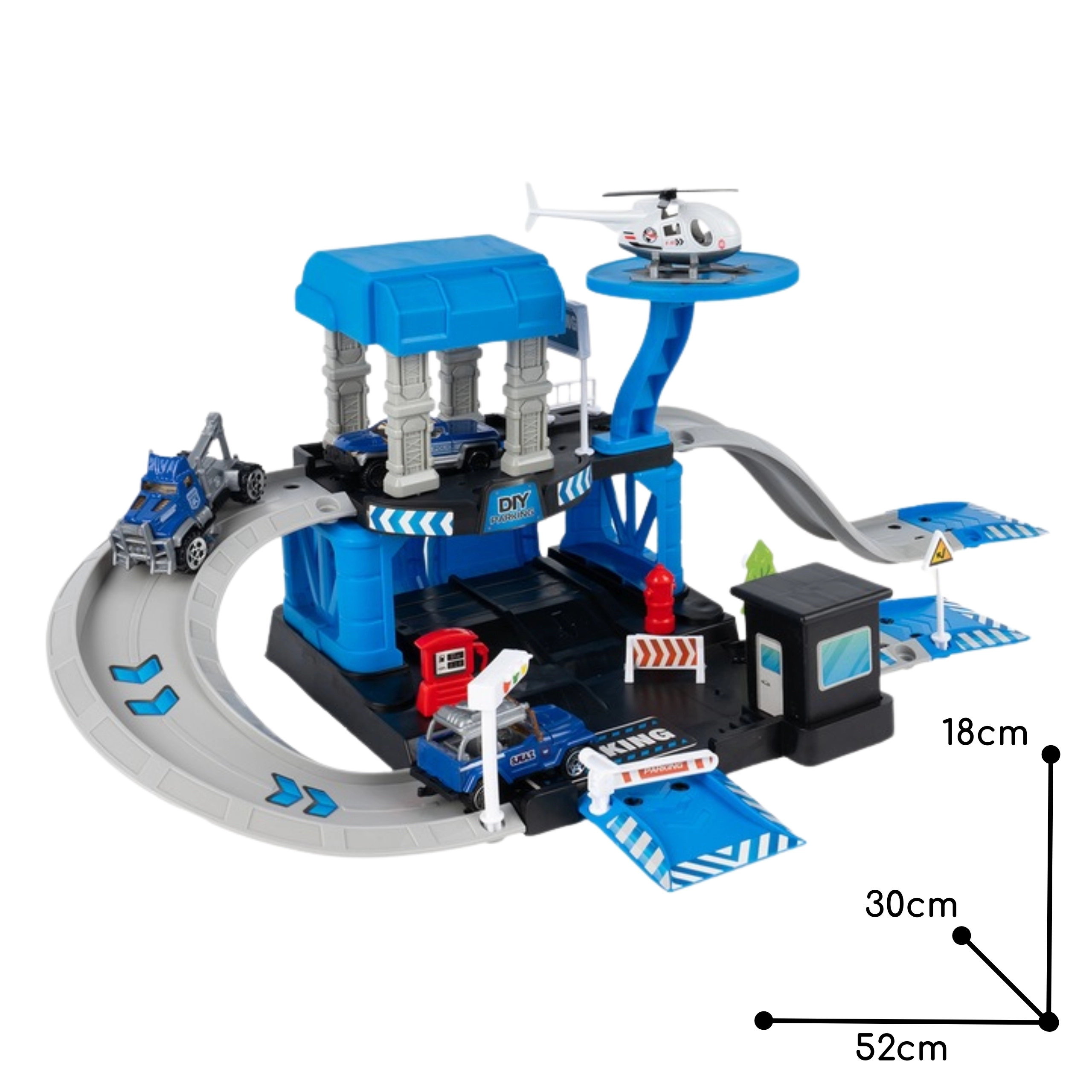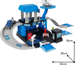 Maak je eigen politiestad! Dit tweelaagse parkeersysteem met commissariaat biedt hellingen, afritten en een landingsplaats voor een helikopter. Dankzij realistische details zoals een tankstation, slagbomen, verkeersborden, verkeerslichten en een wachthokje bedenken kinderen moeiteloos talloze verhalen en missies.