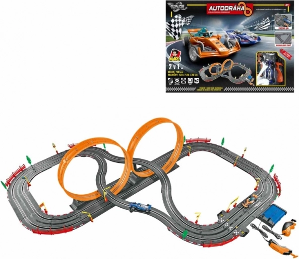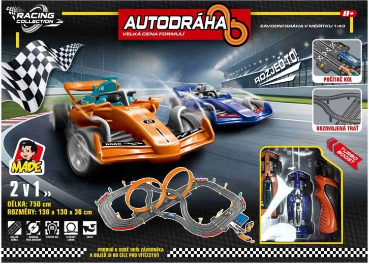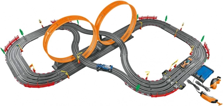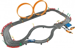 Deze racebaan met formule-auto’s verandert de woonkamer in een circuit. Dankzij de robuuste constructie en doordachte lay-out biedt hij dynamische races, eenvoudige bediening en is hij direct klaar voor gebruik dankzij de meegeleverde 12 V-adapter. De afmetingen van de gemonteerde baan, 138 × 130 × 36 cm, bieden voldoende ruimte voor spannende passages.