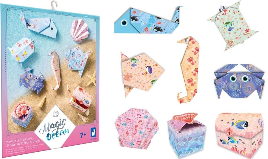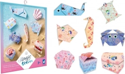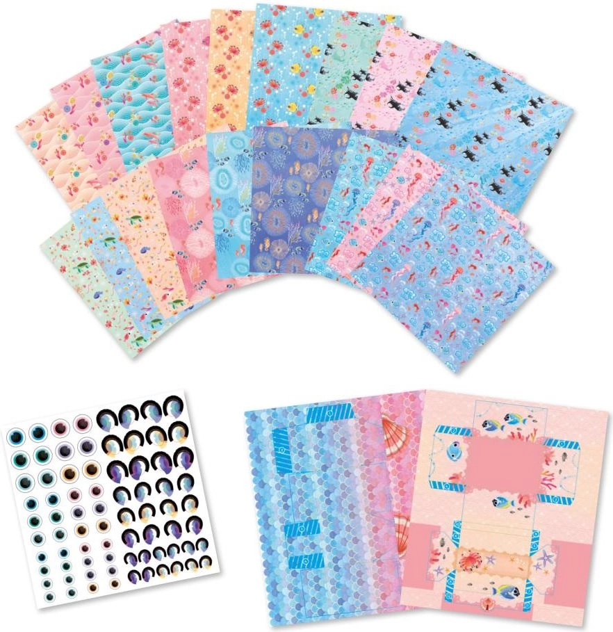 De set Mini origami magische oceaan bevat alles wat je nodig hebt voor speels papieren knutselen: kleurrijke vellen met oceaanmotieven, een stickervel met oogjes en een eenvoudige handleiding. Ideaal voor de eerste stappen in de wereld van origami of voor een creatief middagje met kinderen.